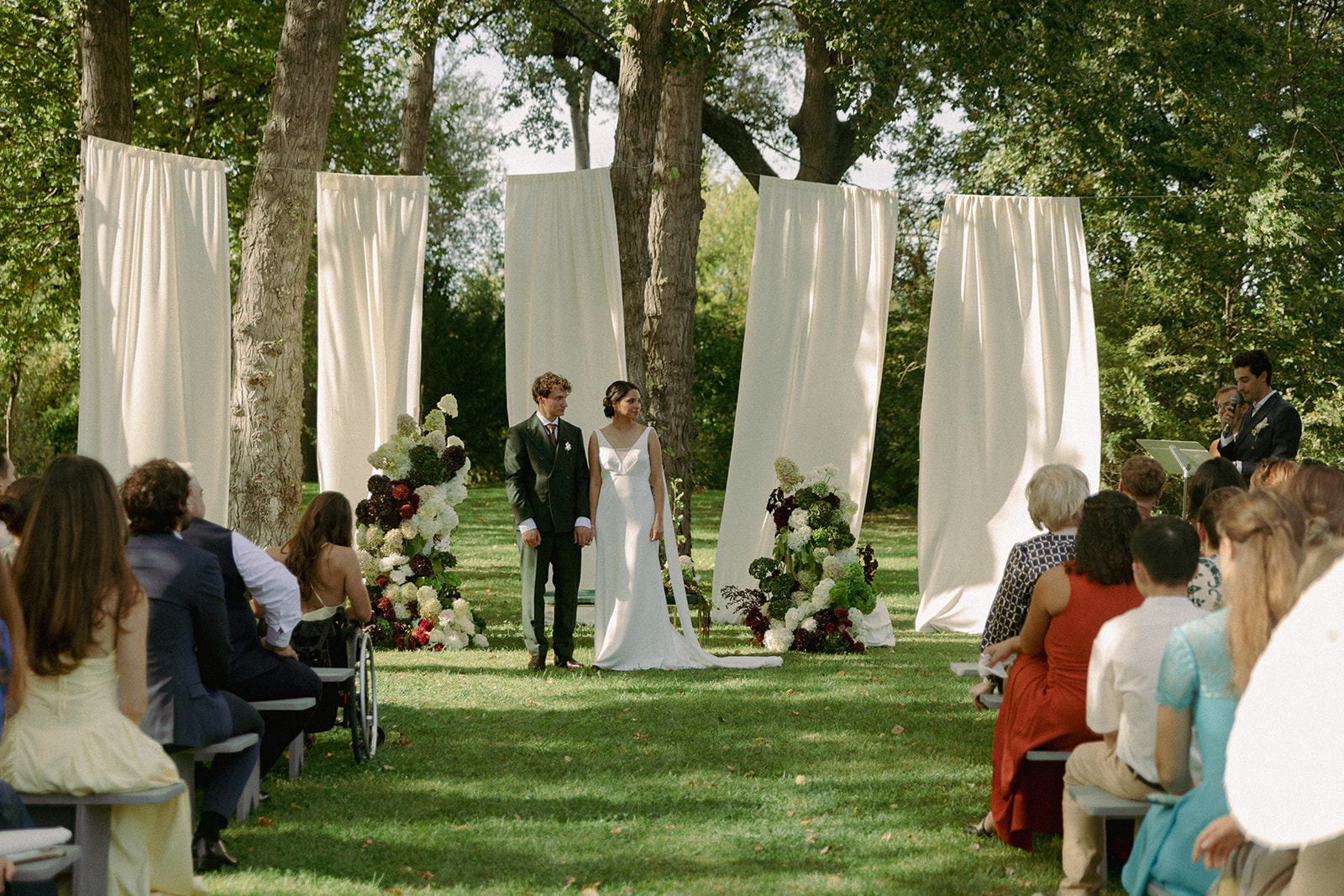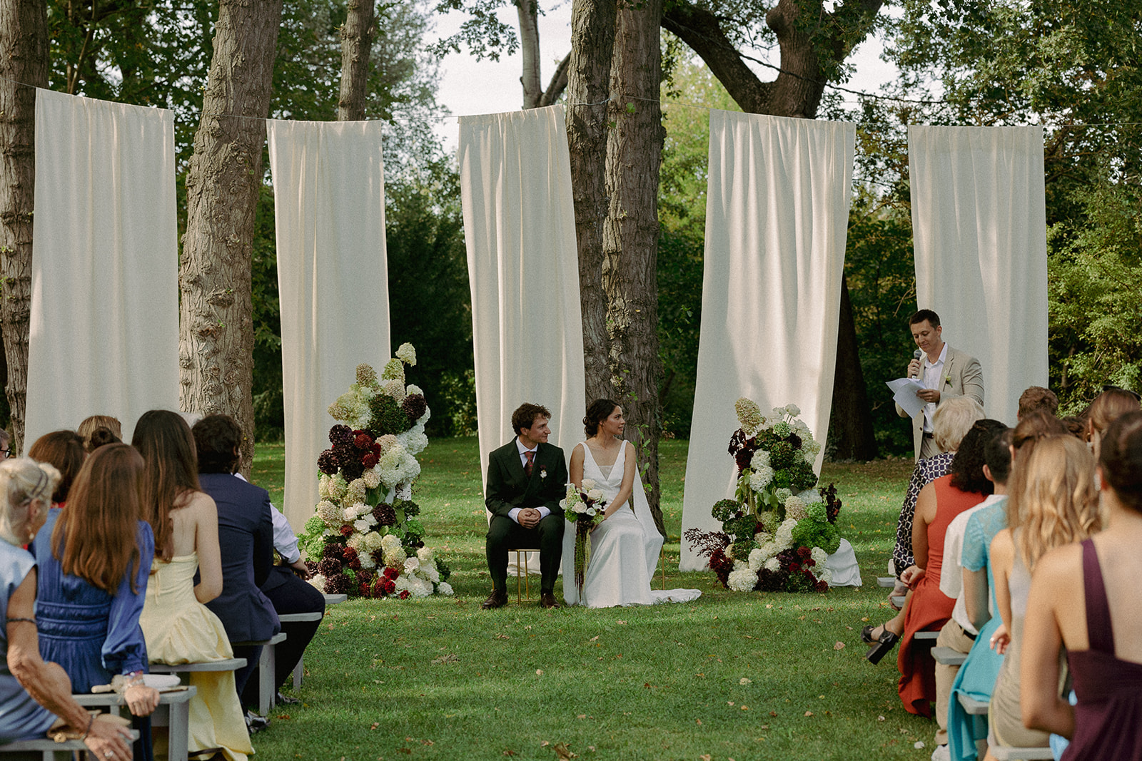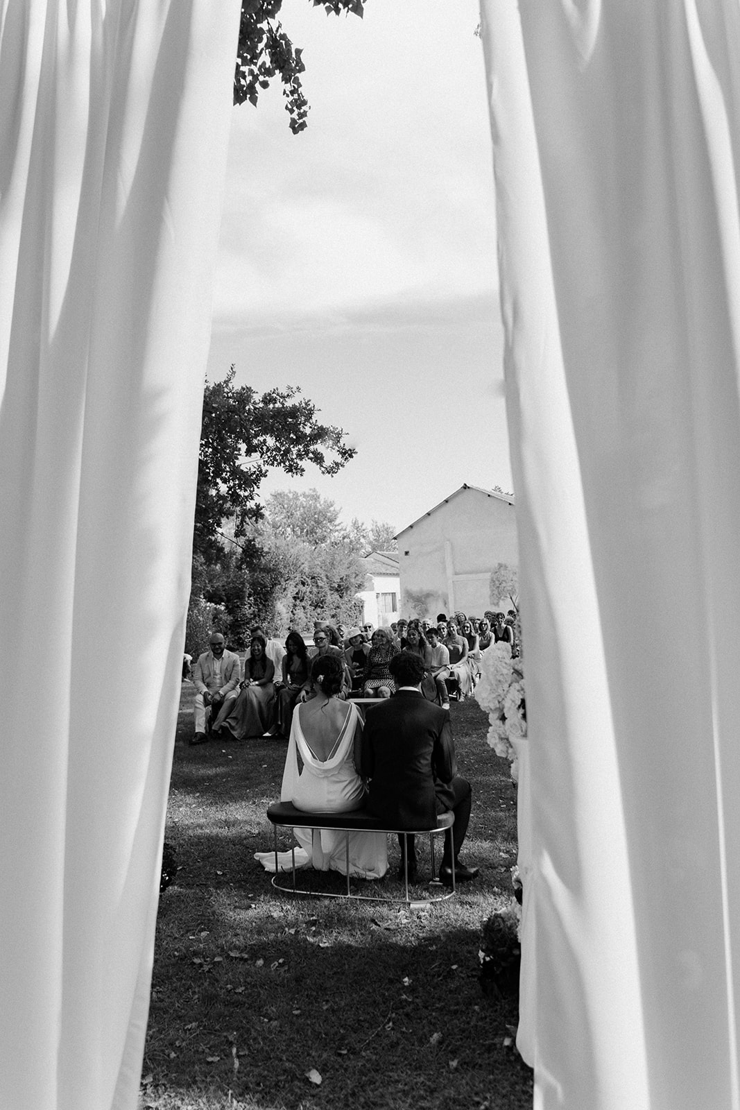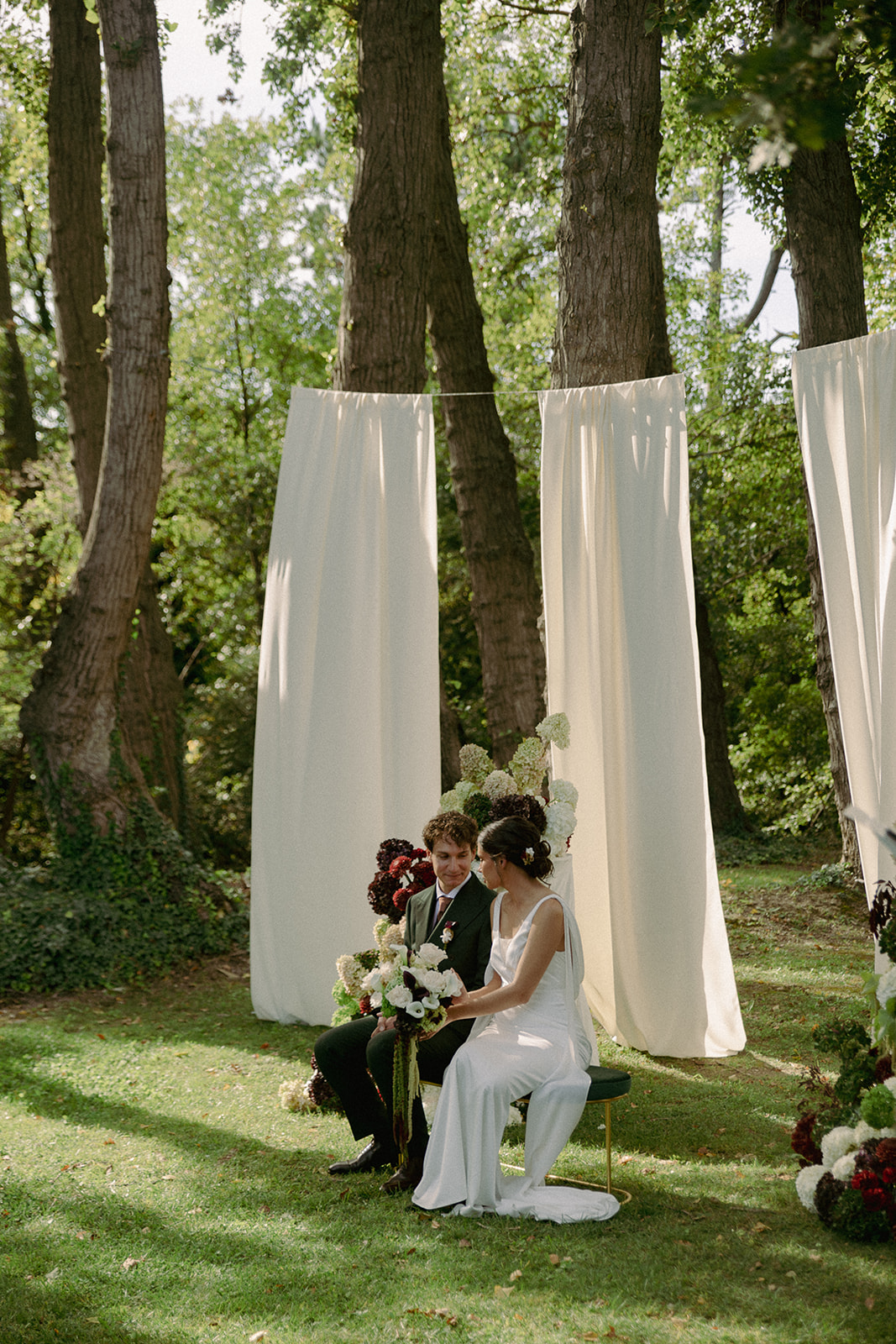 Le lieu de cérémonie, avec l’impression de grandeur et légèreté apporté par des grands draps entre les arbres.