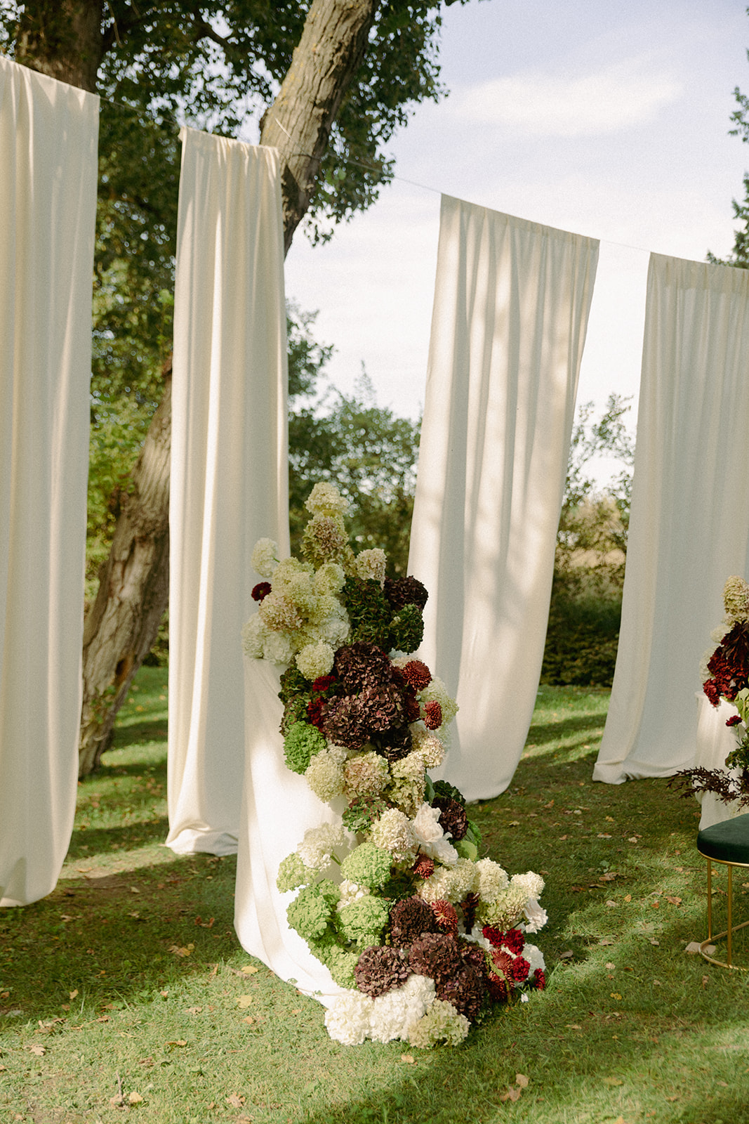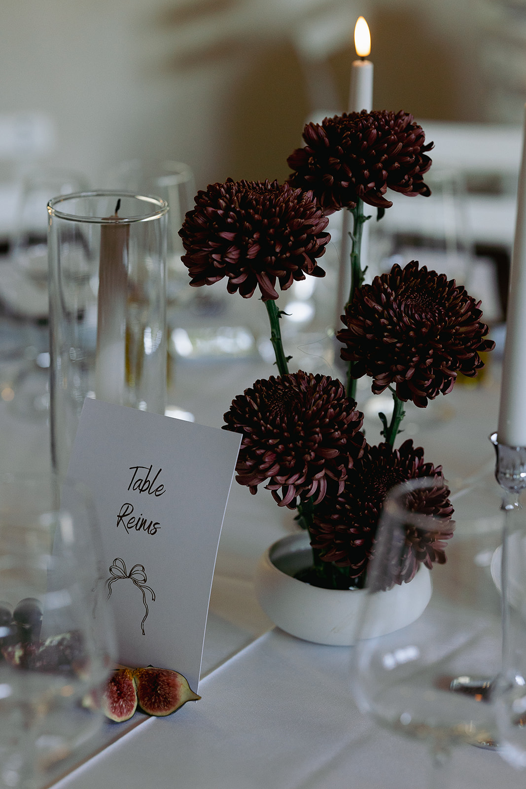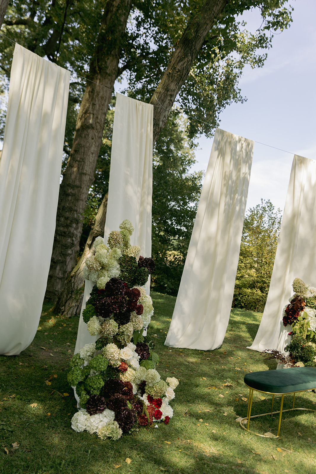 Des drapés blancs flottants pour donner une impression de légèreté (y.c. lieu de cérémonie), des compositions florales en hauteur, fruits (grenades, raisins), fleurs (hortensias de différentes couleurs, Anthuriums bordeaux, Callas noirs).