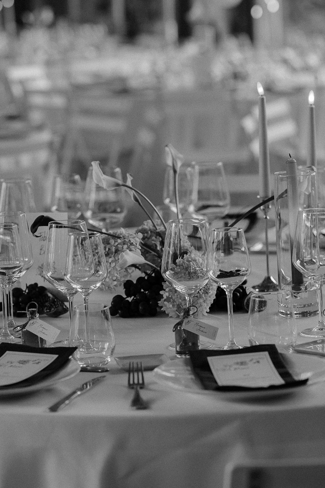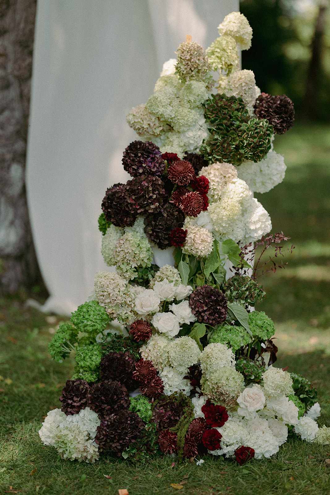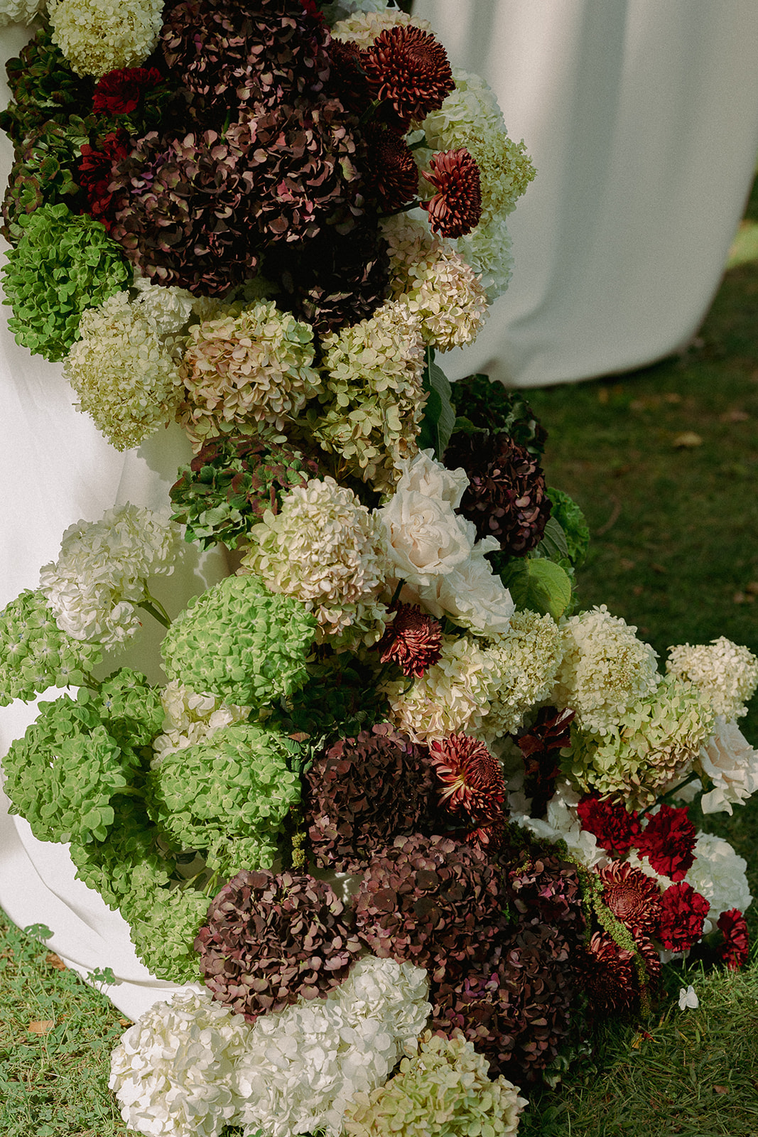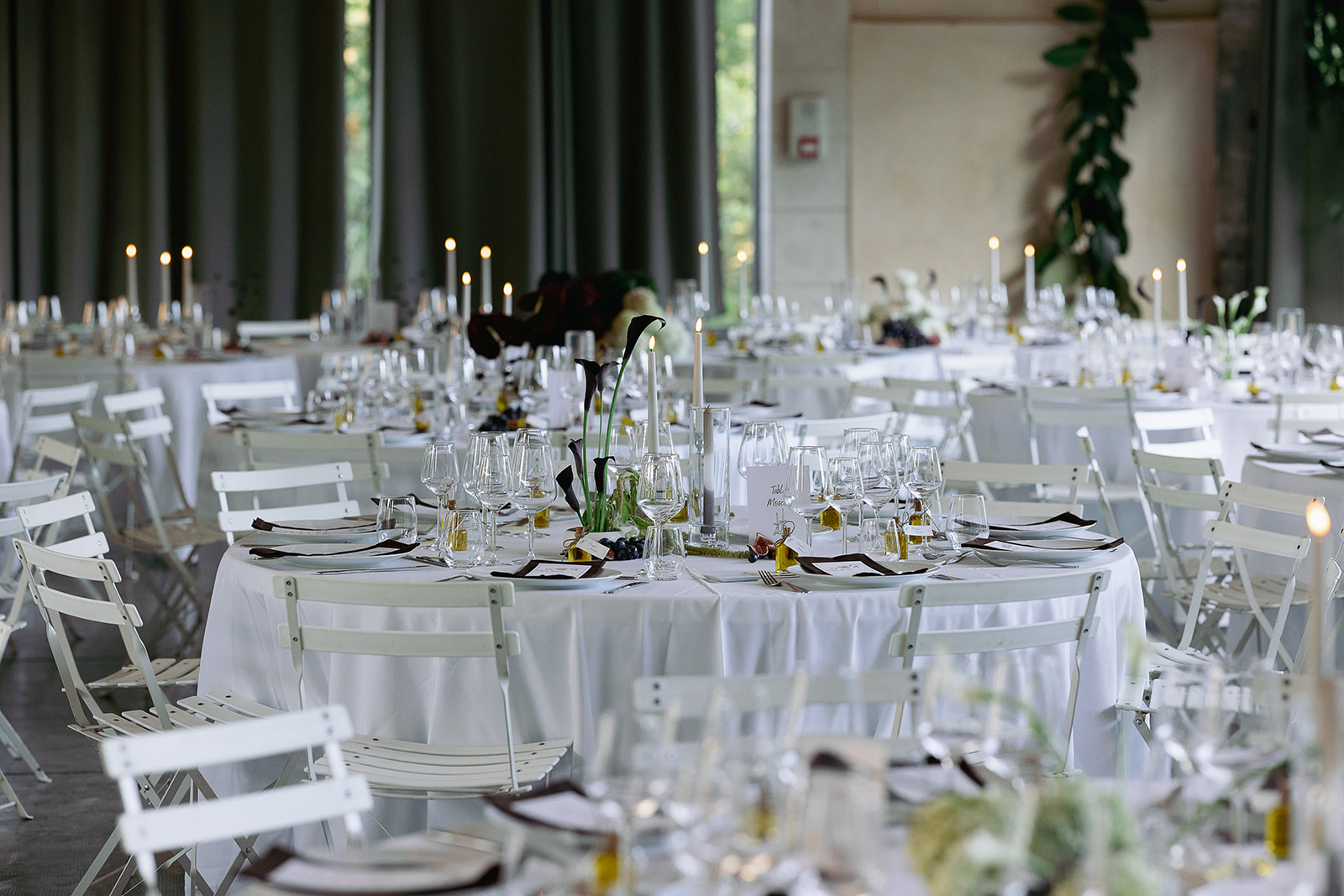 Des drapés blancs flottants pour donner une impression de légèreté (y.c. lieu de cérémonie), des compositions florales en hauteur, fruits (grenades, raisins), fleurs (hortensias de différentes couleurs, Anthuriums bordeaux, Callas noirs).