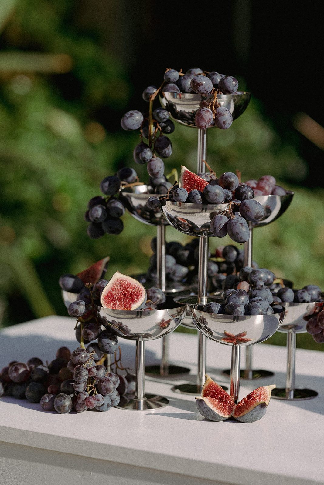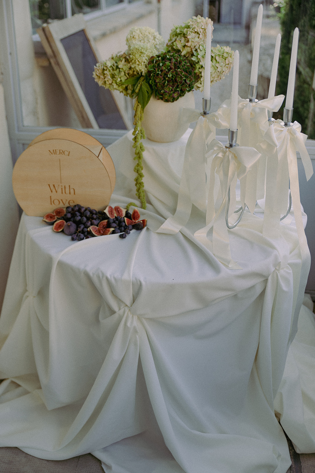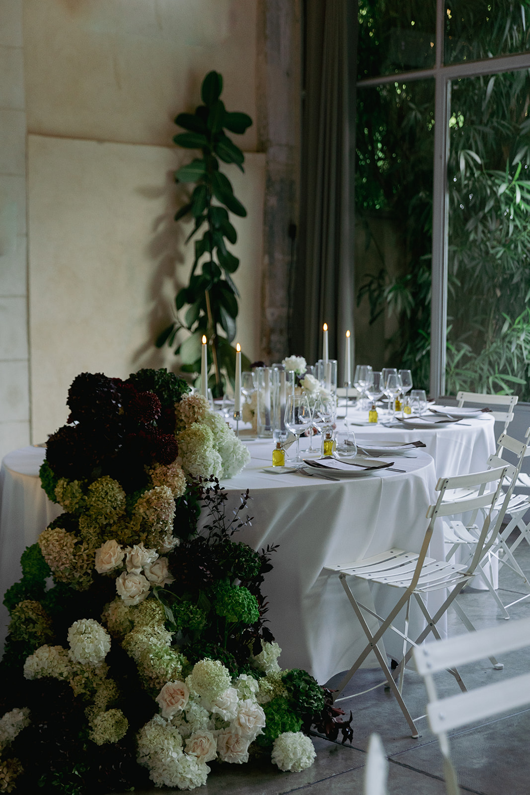 Pensée comme une parenthèse chic et chaleureuse, leur célébration se dessine dans une palette subtile, entre blancs lumineux, verts profonds et touches bordeaux. Drapés aériens, compositions florales sculpturales, fruits gorgés de soleil — ici, la mise en scène ne cherche jamais à en faire trop, mais à raconter avec justesse.