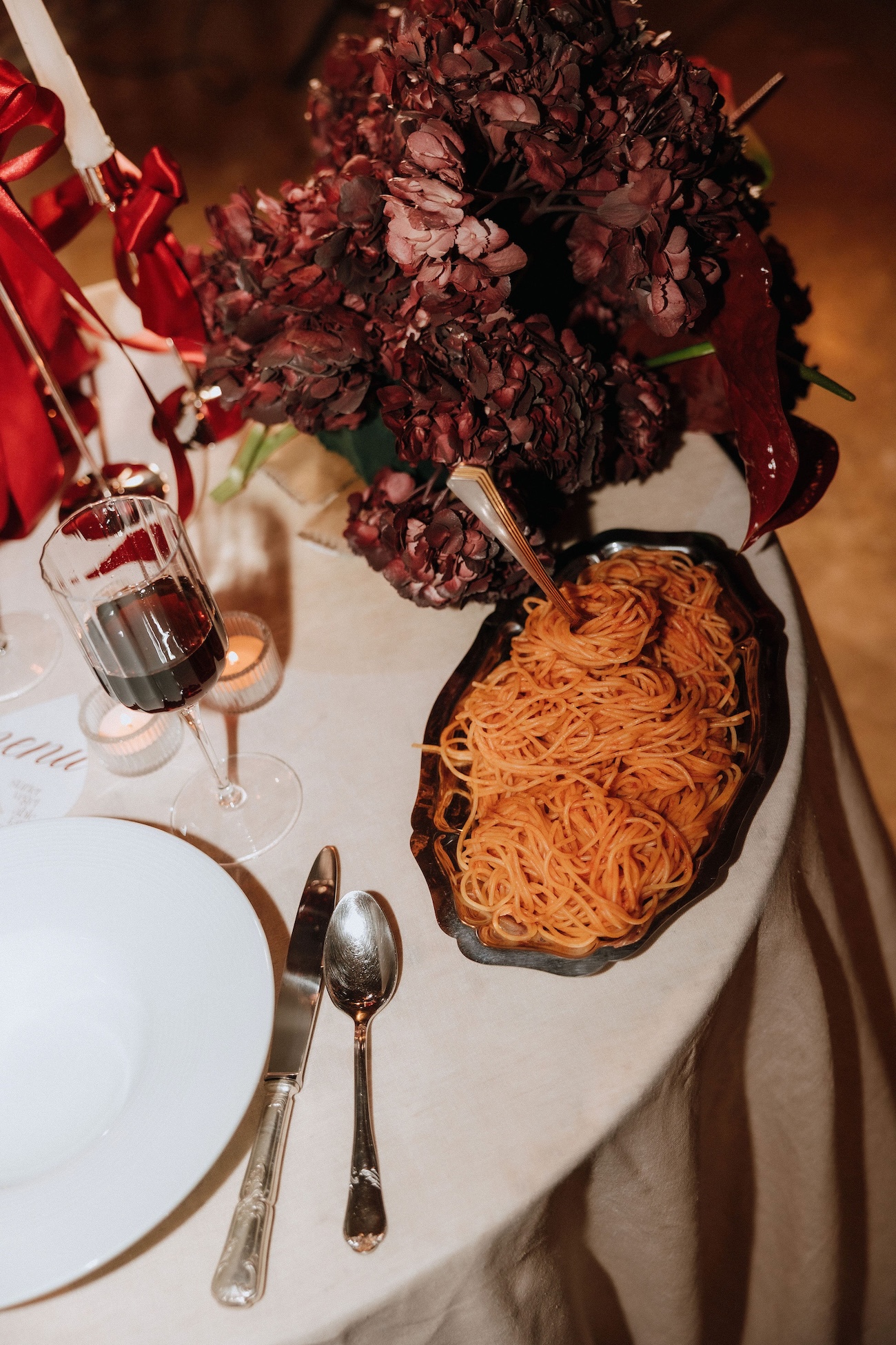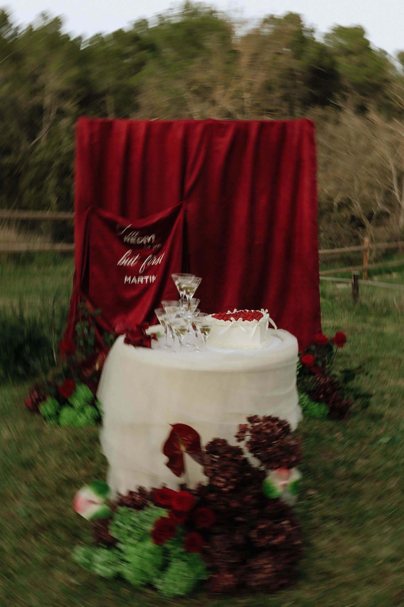 Nous avons travaillé une esthétique contemporaine, tout en conservant une certaine intemporalité. Le rouge a été mis en valeur par des matières nobles et contrasté avec des tonalités plus neutres pour créer un équilibre visuel raffiné. Des drapés fluides viennent structurer les espaces, apportant du mouvement et de la texture à la mise en scène. L’objectif était de proposer une vision audacieuse du mariage, où passion et élégance se rencontrent dans un décor intimiste et chaleureux.