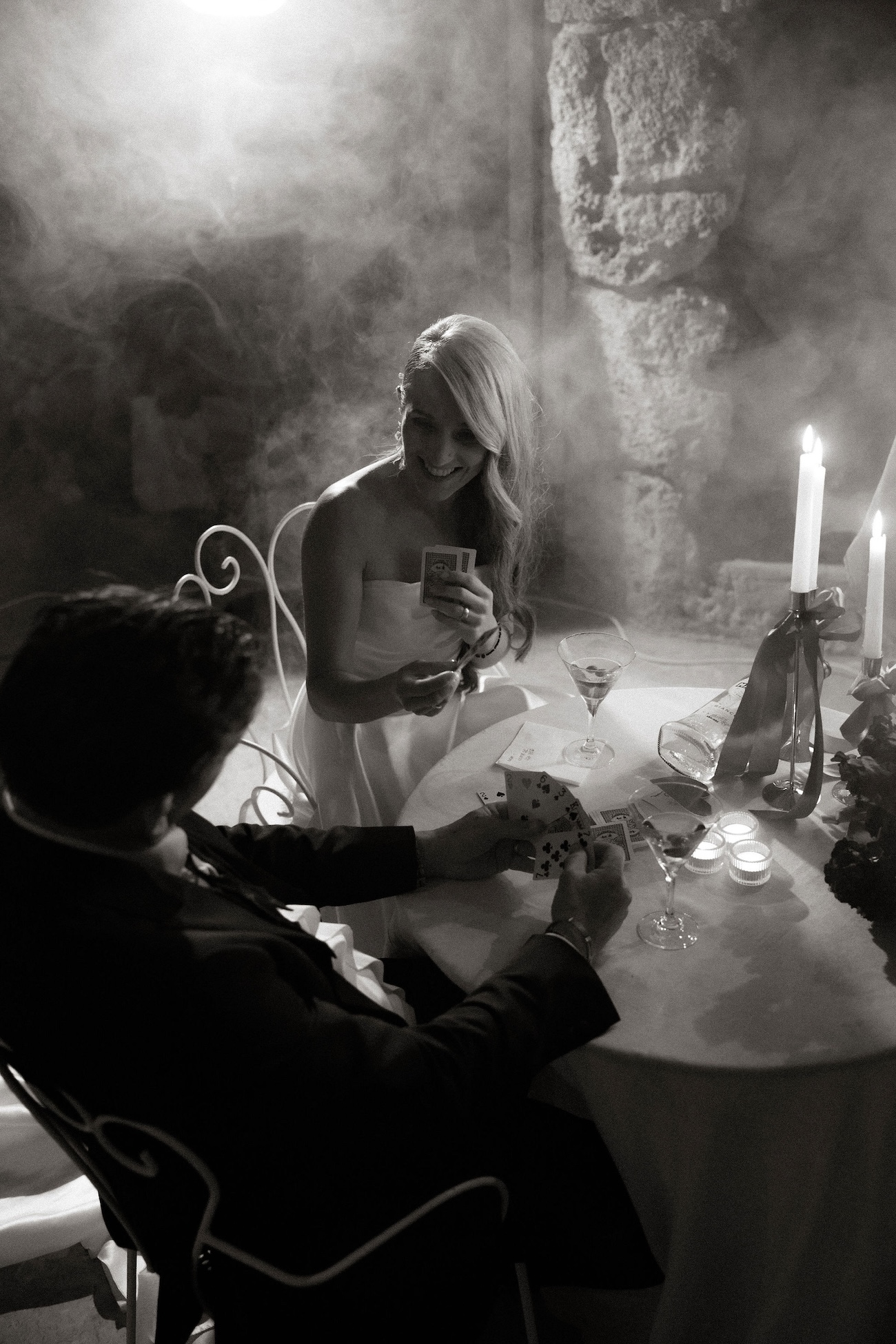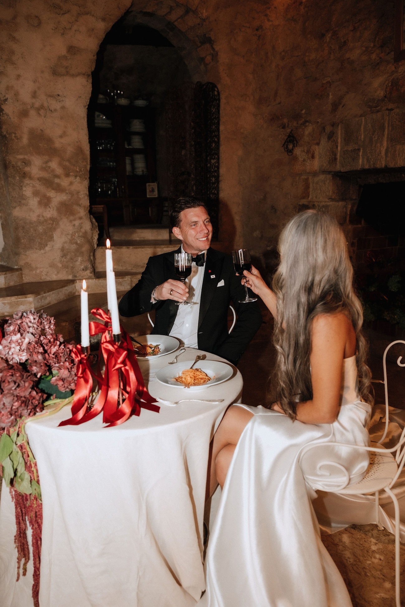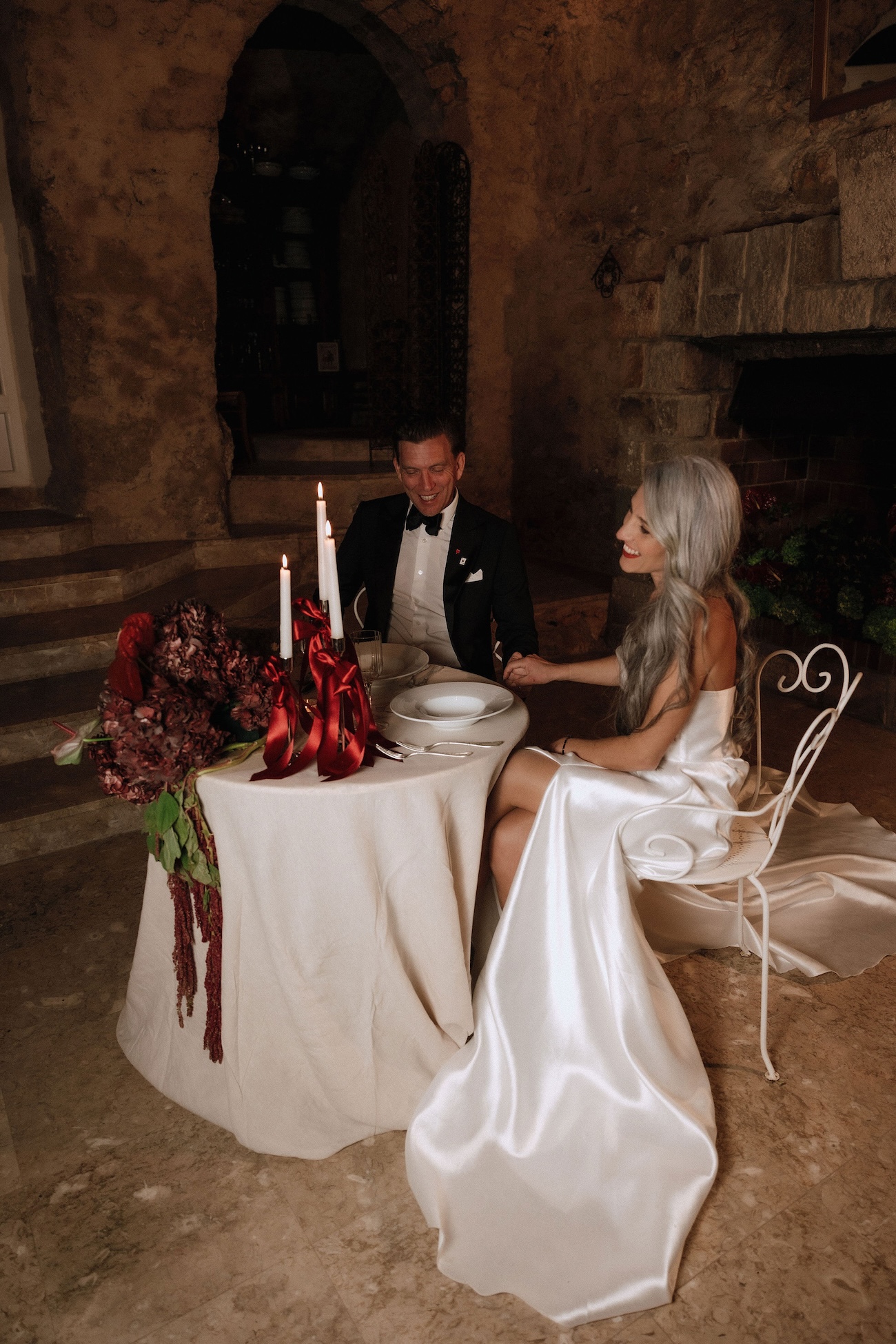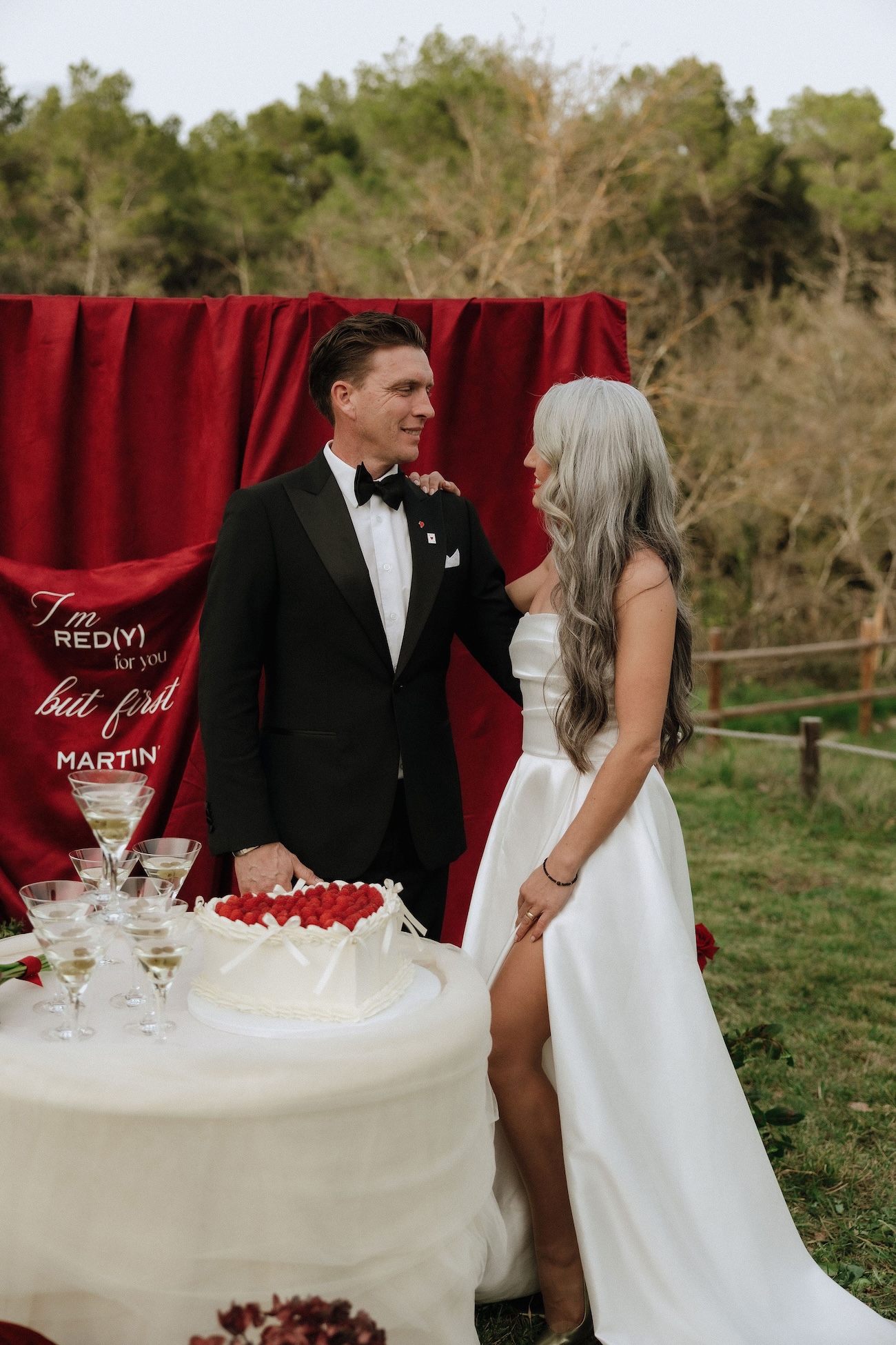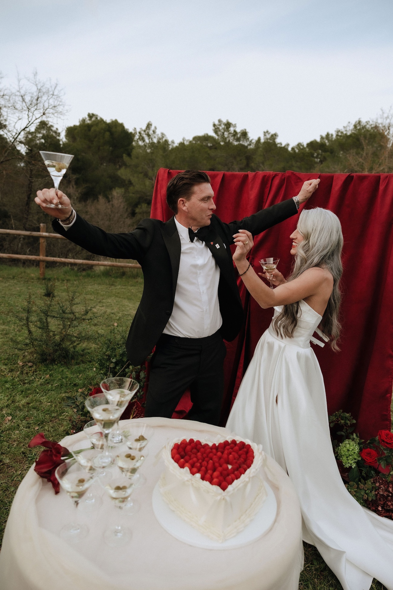 Ici, chaque détail devient une déclaration : la robe de mariée satinée aux lignes pures qui capte la lumière, le marié sans boutonnière assumant un style minimaliste et affirmé, la convivialité d’une table de partage sublimée par une scénographie élégante, ou encore la fontaine à martini et la Porsche vintage, symboles de caractère et de fête.