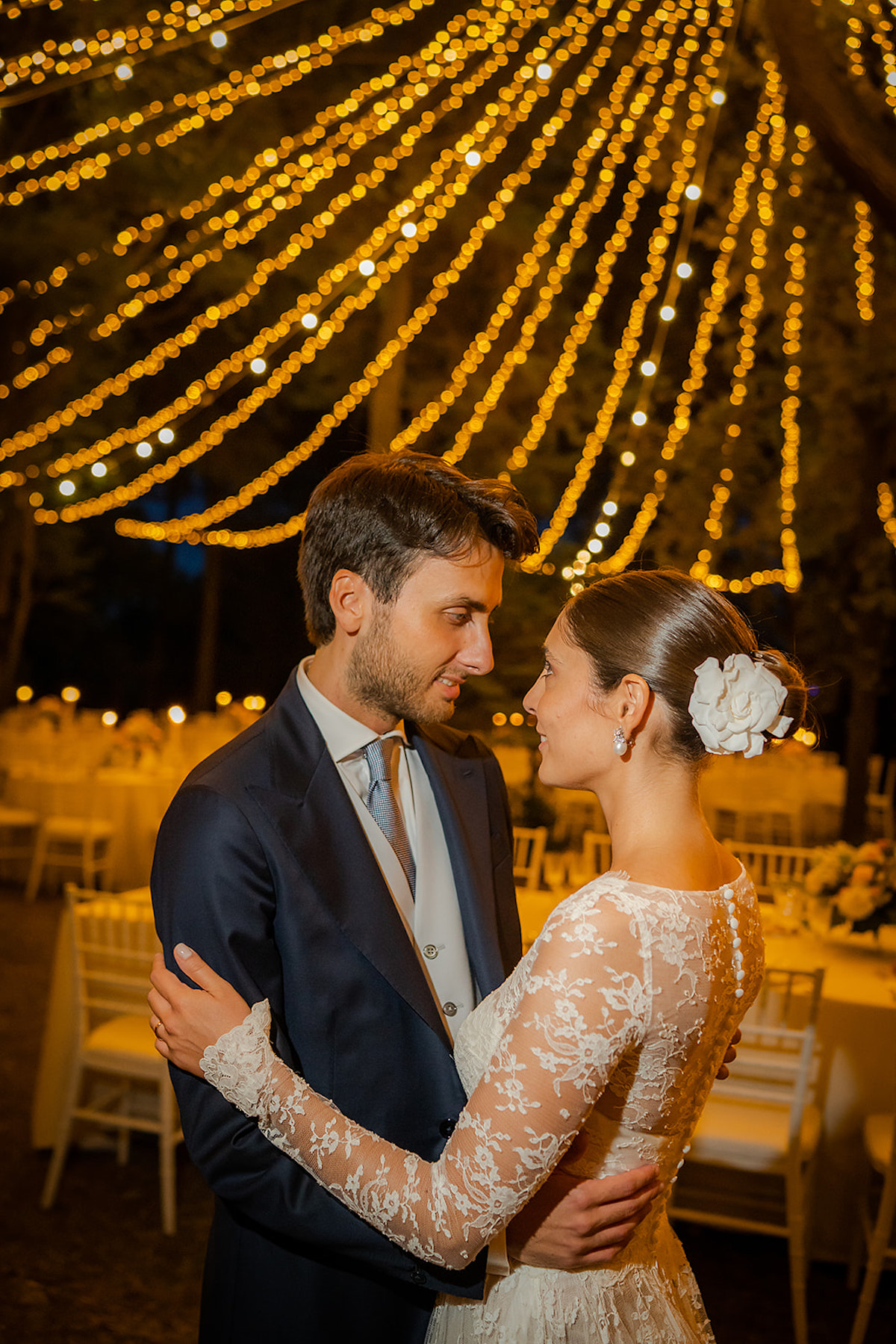 Après une longue recherche, Cecilia est tombée amoureuse d’une robe de l’atelier Iris Noble. La dentelle précieuse qui dansait sur son corps, l’élégance de la silhouette et l’infinie délicatesse de la matière en mouvement, lui ont fait sentir la mariée qu’elle rêvait d’être.