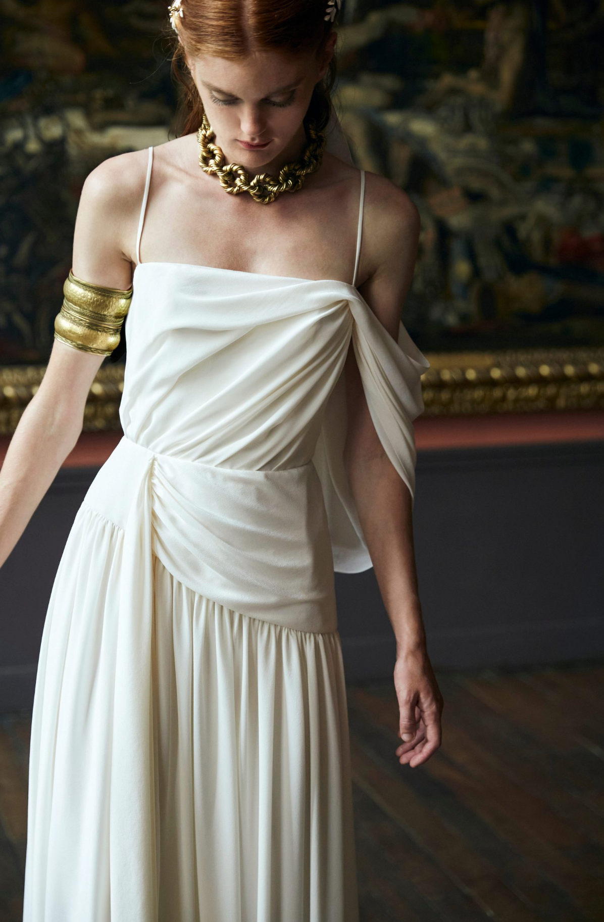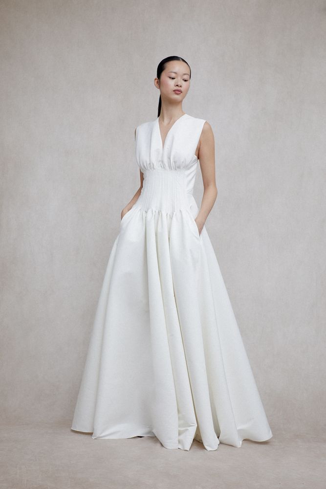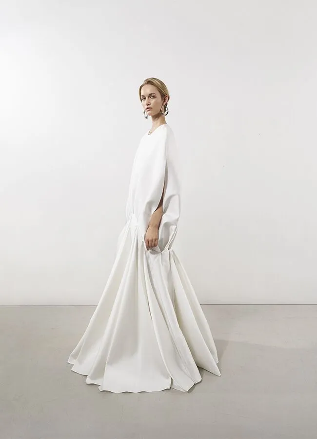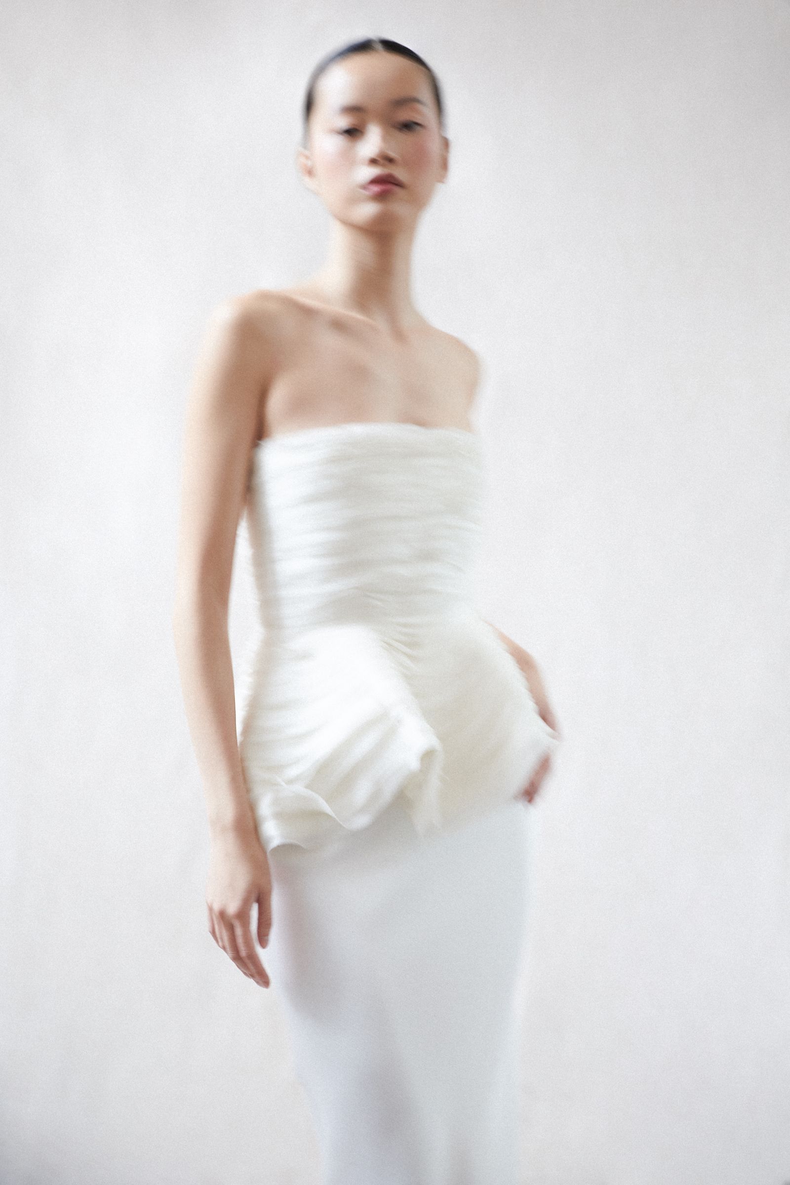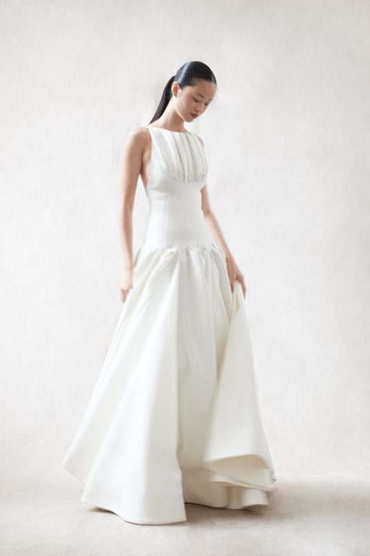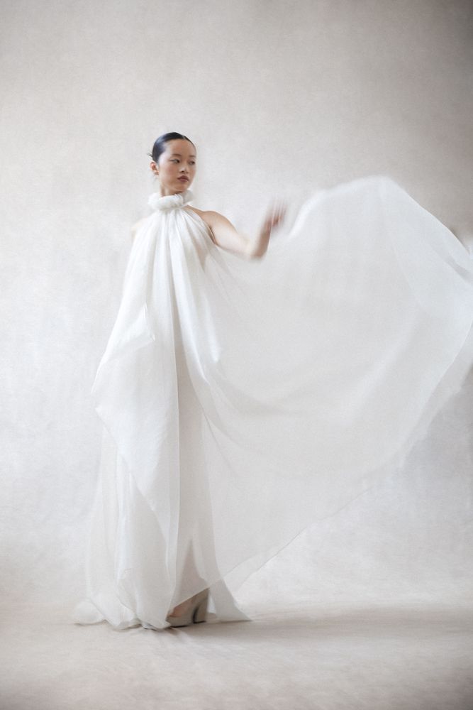 NEWHITE met l’accent sur des lignes fluides, des tissus de qualité tels que le crêpe, la soie et la dentelle fine, et des silhouettes intemporelles qui flattent la silhouette sans être trop extravagantes.