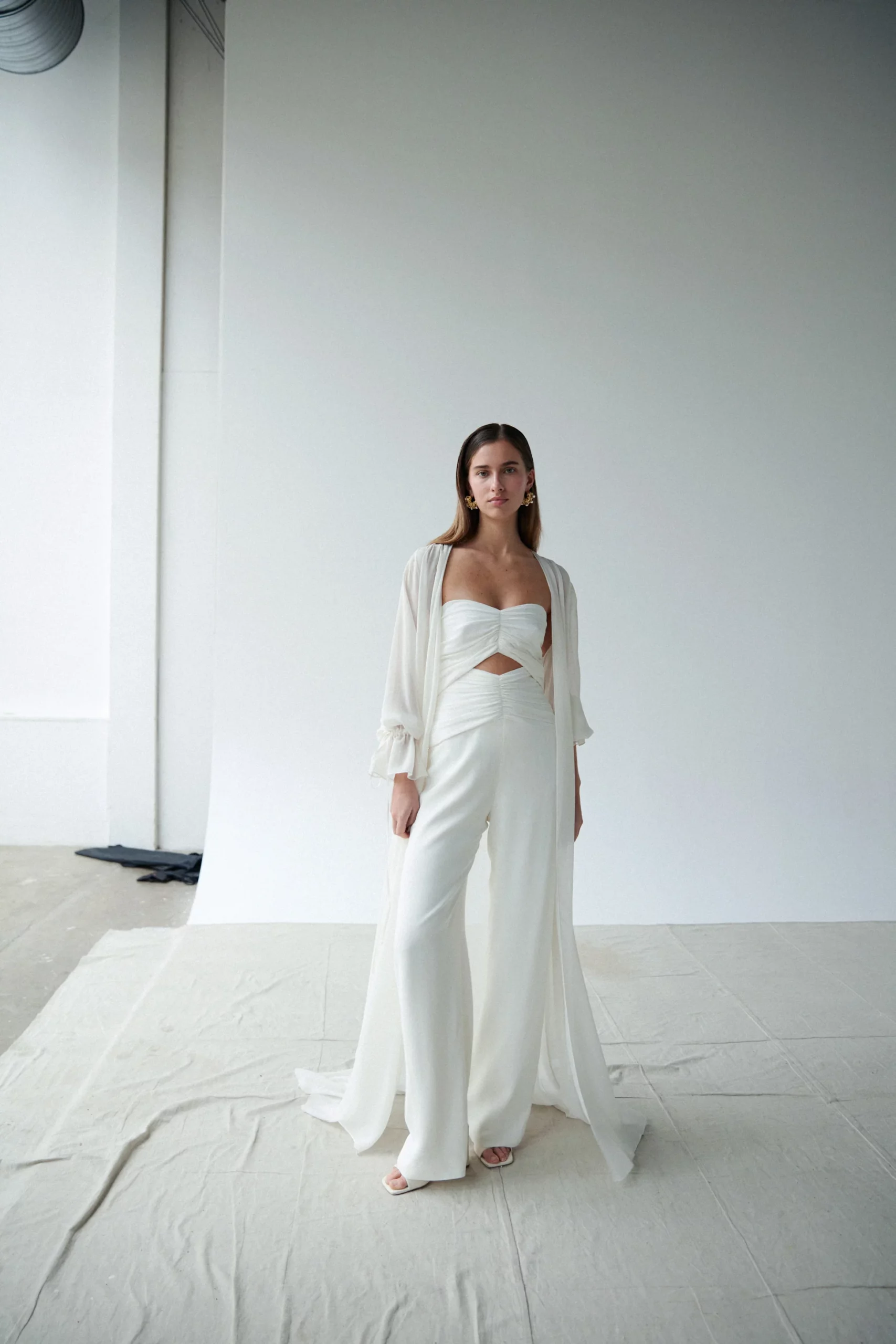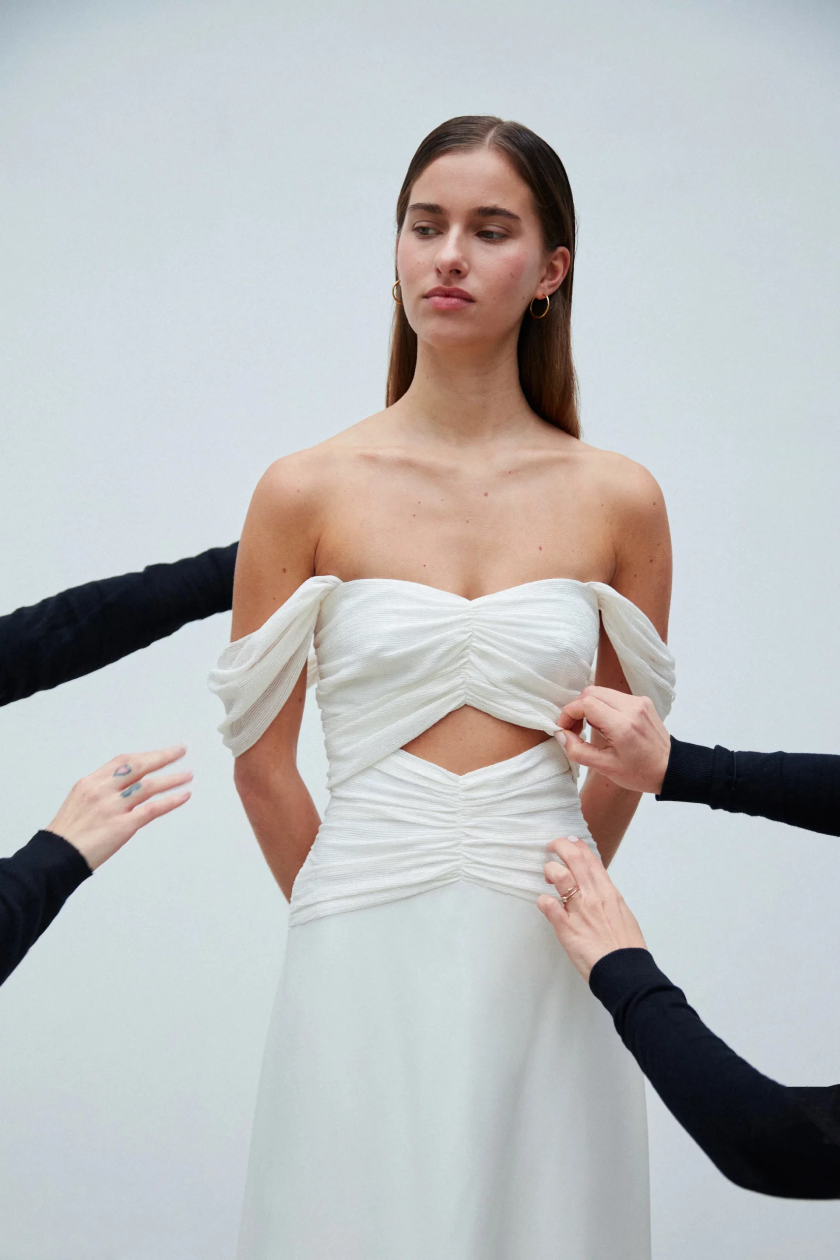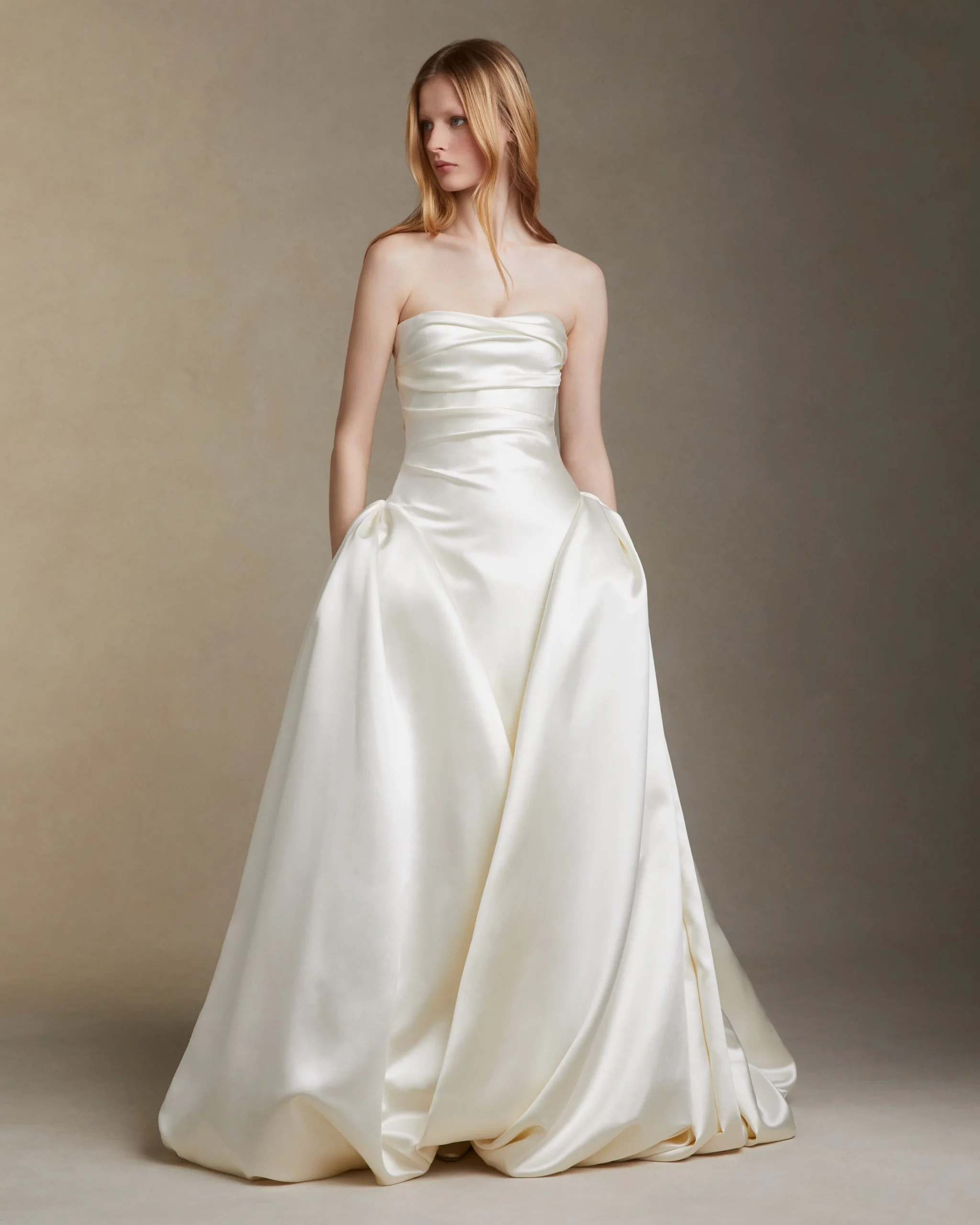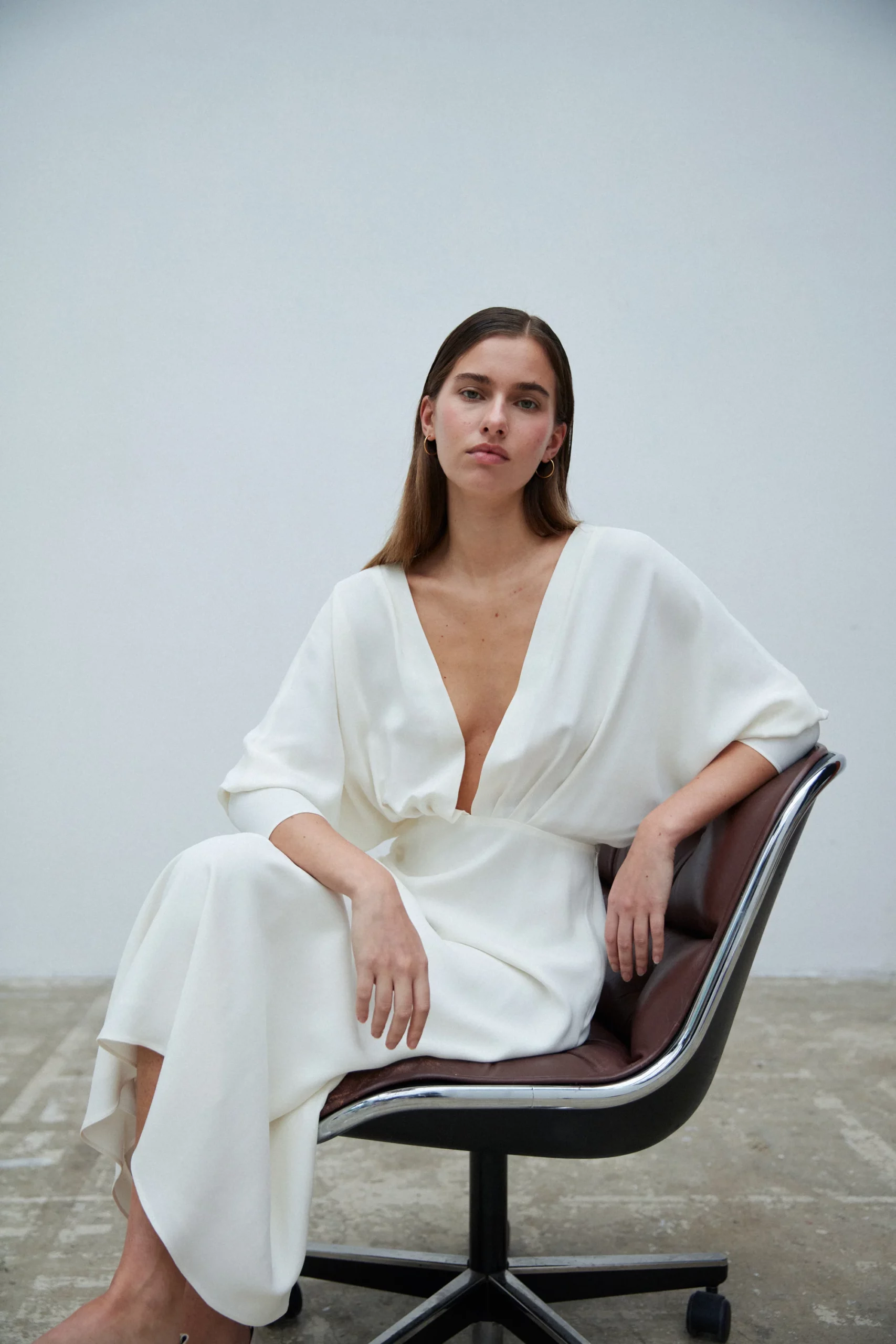 NEWHITE met l’accent sur des lignes fluides, des tissus de qualité tels que le crêpe, la soie et la dentelle fine, et des silhouettes intemporelles qui flattent la silhouette sans être trop extravagantes.