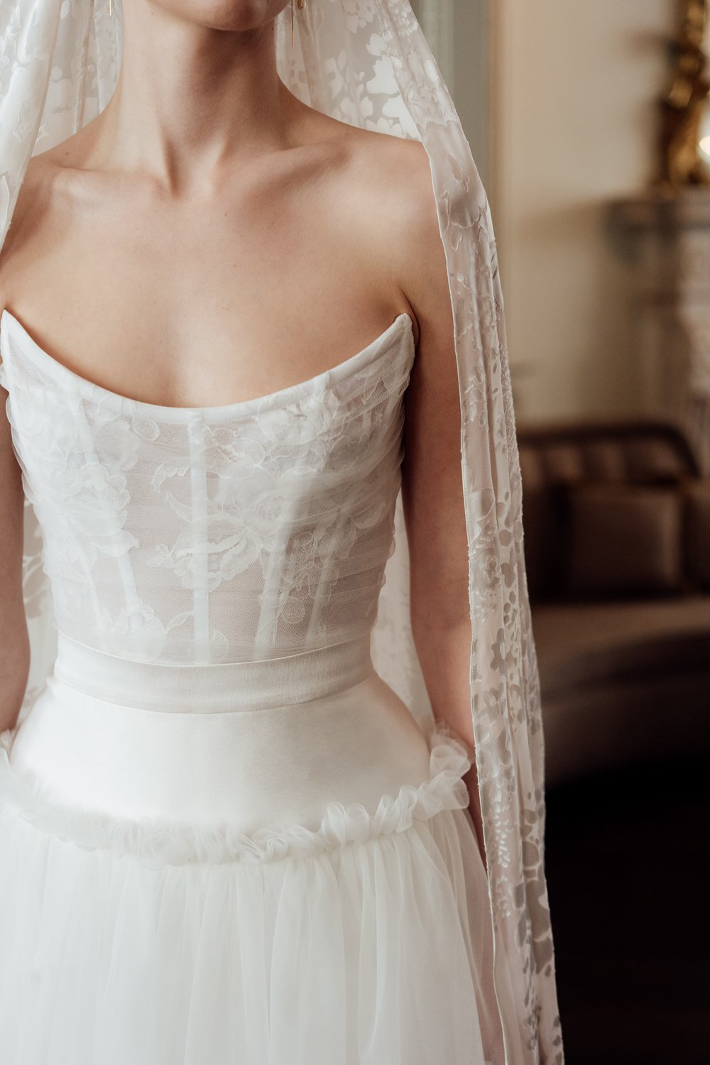 L’univers d’Édith Bréhat repose sur un travail méticuleux, où chaque robe est conçue pour s’adapter parfaitement à la silhouette de la mariée.