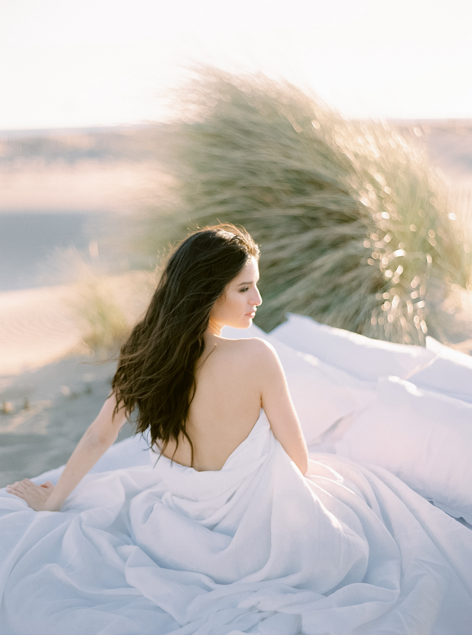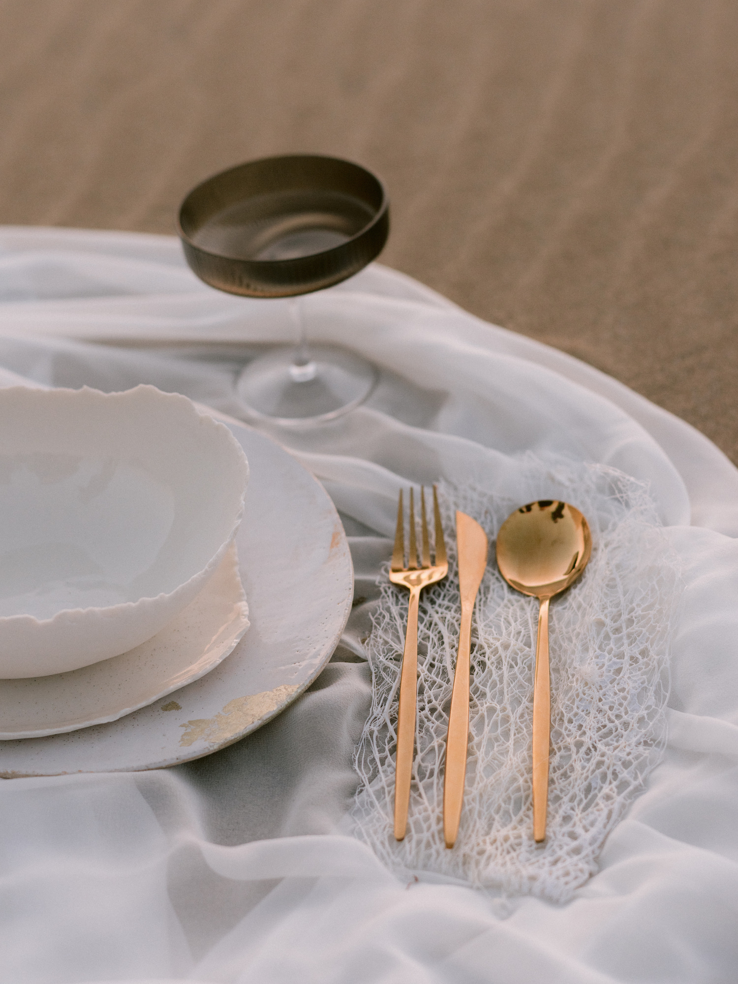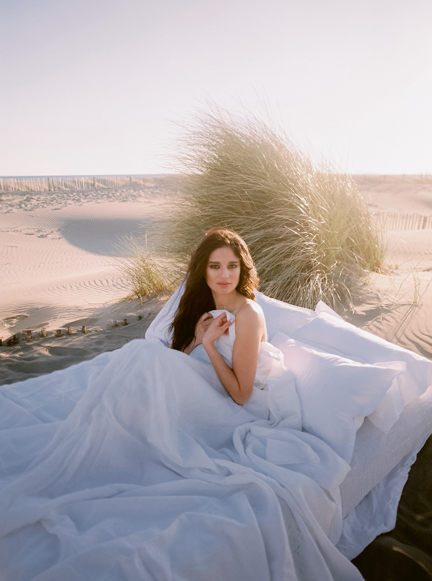 J’imaginais des tissus aériens qui viennent à peine caresser le sable ou qui volent au vent. J’ai fait appel à Maison Note pour ces pans de tissus exceptionnels. Elle propose des soies et des matières de grande qualité. Les coloris sont d’une subtilité unique car elle teint elle même à partir de matières naturelles comme des coques de noix ou des noyaux d’avocats.