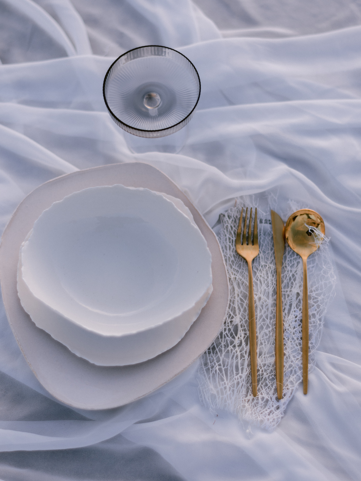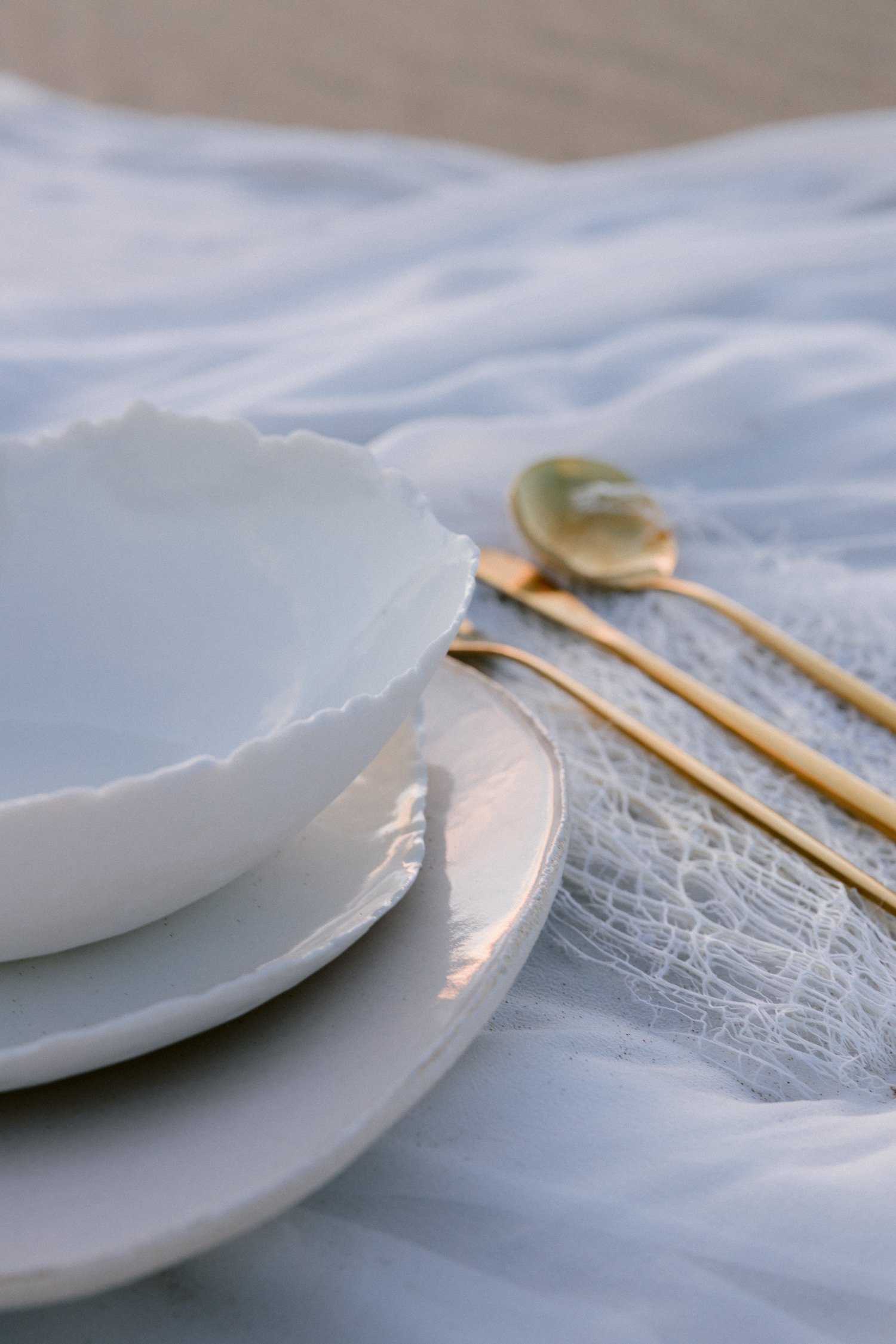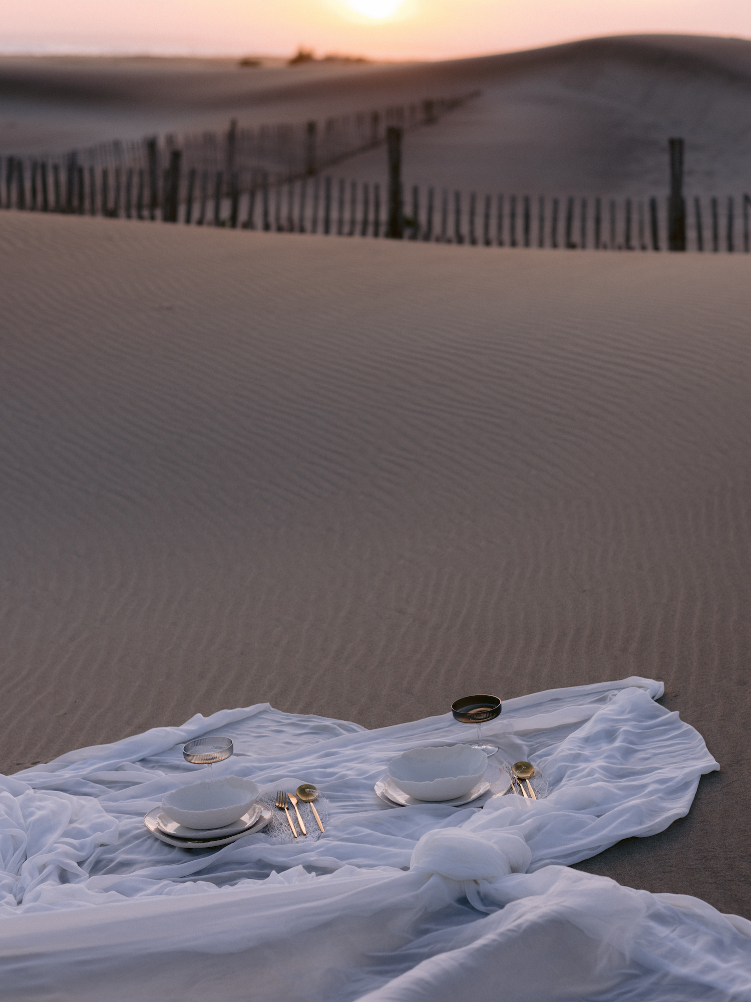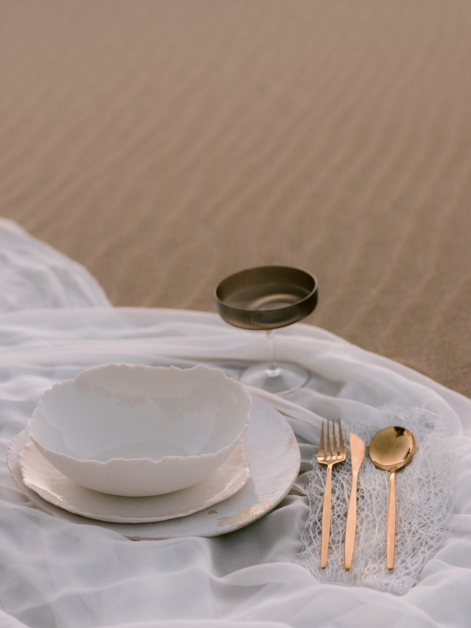 J’imaginais des tissus aériens qui viennent à peine caresser le sable ou qui volent au vent. J’ai fait appel à Maison Note pour ces pans de tissus exceptionnels. Elle propose des soies et des matières de grande qualité. Les coloris sont d’une subtilité unique car elle teint elle même à partir de matières naturelles comme des coques de noix ou des noyaux d’avocats.