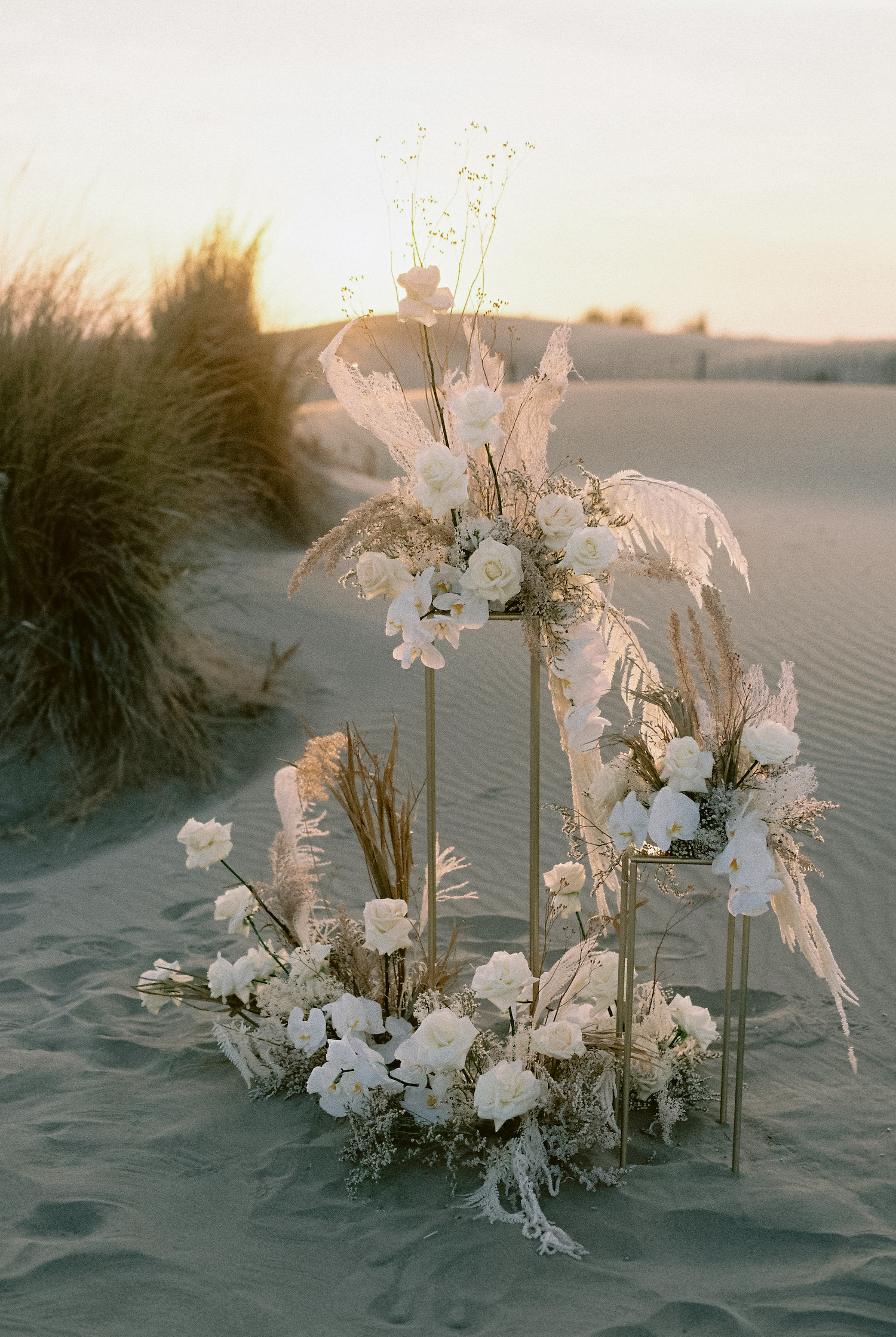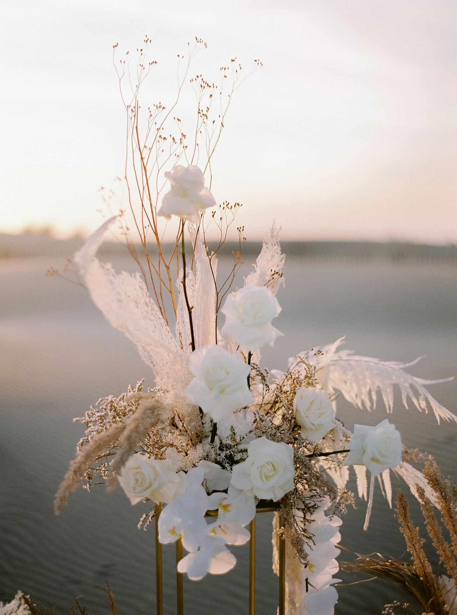 J’ai demandé à ma complice Fleurs de Fée d’assurer le décor floral. J’avais envie d’installations. Du beige, du blanc, du délicat, du sauvage et une touche de précieux avec les orchidées blanches.