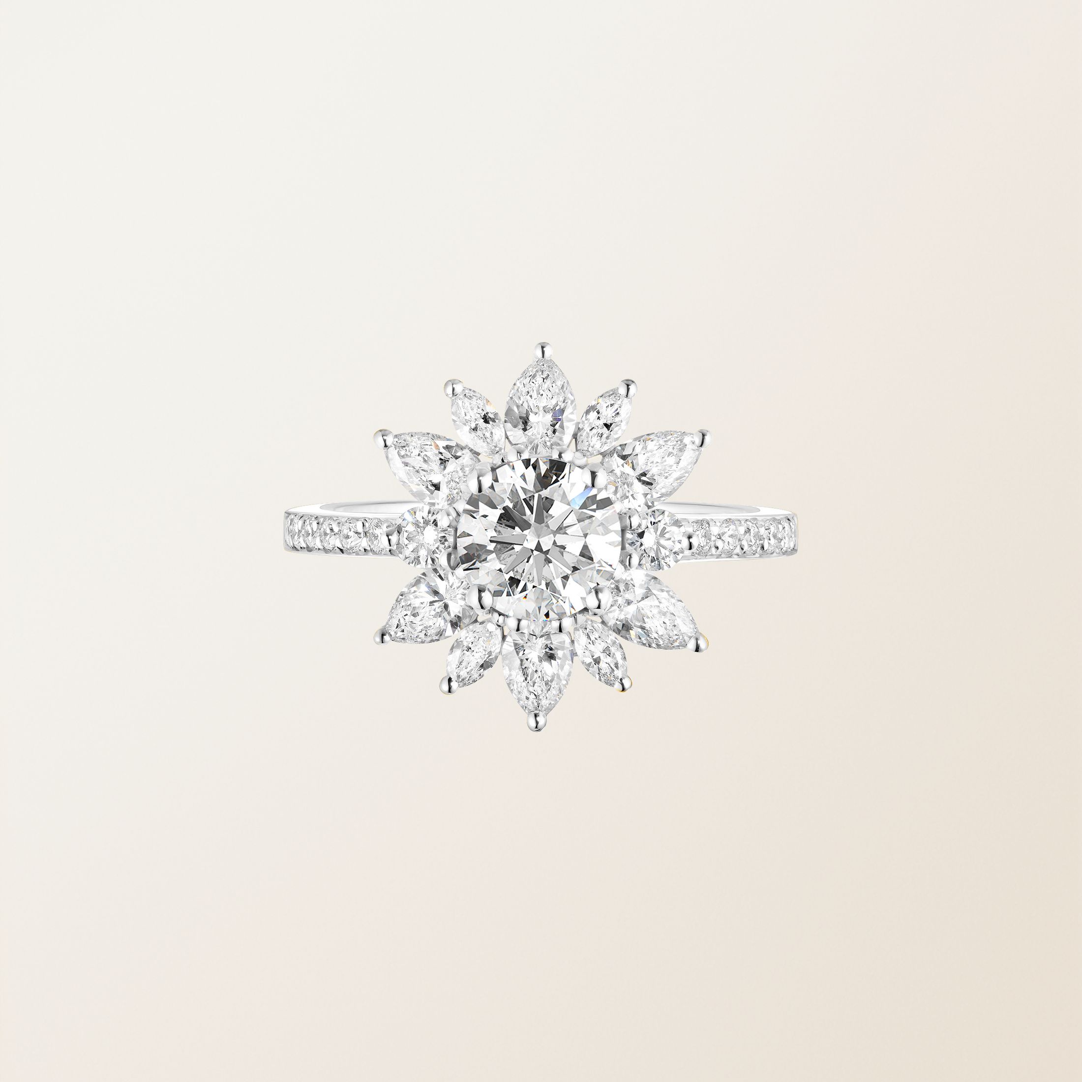 La bague EverBloom Prima en Diamant et Or blanc 750 ‰ est un enchantement pour les yeux. Finement enchâssé dans un serti griffes, une pierre de centre de 6 mm orne la bague. Autour d’elle se déploient 10 pétales délicatement symbolisés par 6 diamants poires et 4 diamants navettes, eux aussi maintenus par de fines griffes de métal. Grâce au remarquable savoir-faire de nos ateliers, l’on assiste au plus parfait épanouissement d’une fleur. Le corps de bague se pare d’un pavage de 16 diamants taille brillant. Une fois rabattues sur la pierre, l’extrémité de chaque griffe est boulée et polie. Sa fabrication est conçue pour rendre son porté confortable et que les pierres n’accrochent pas. EverBloom Prima est résolument un bijou d’exception.