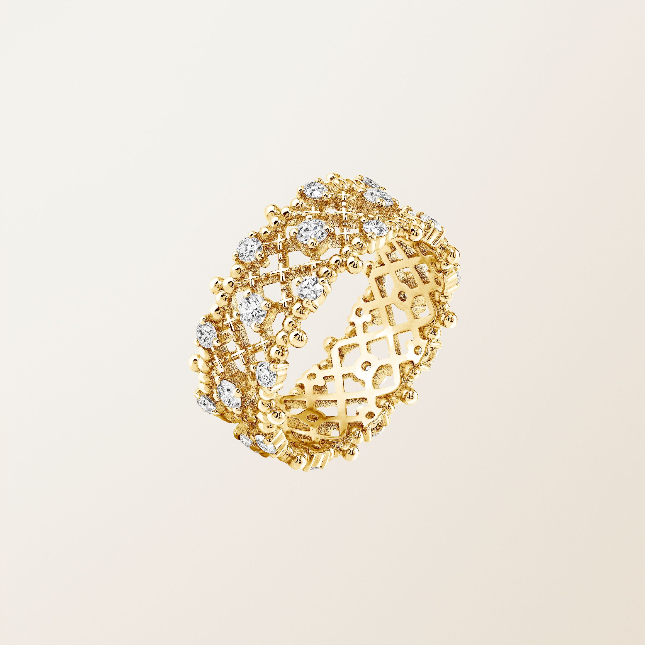 - Une régularité dans le motif où se mêle une fine dentelle d’or et de diamants entourée de petites perles polies étincelantes