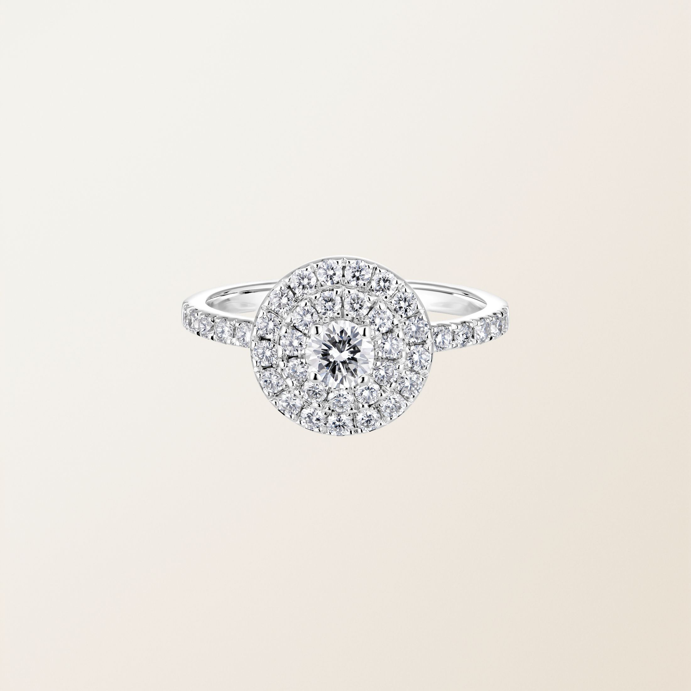 La bague Rétromantique Duo Pavée en Or blanc 750 ‰ et Diamant est un solitaire de 4 mm, encerclé de deux rangées de diamants disposées en balcon. Ce ne sont pas moins de 38 diamants de 1,5 mm qui forment alors un halo lumineux autour de la pierre de centre et la monture. Une fois rabattues sur la pierre, l’extrémité de chaque griffe est boulée et polie. Sa fabrication est conçue pour rendre son porté confortable et que les pierres n’accrochent pas. La brillance et l’effet sont ainsi incomparables : de loin, on peut même avoir l’impression qu’il s’agit d’une pierre unique..