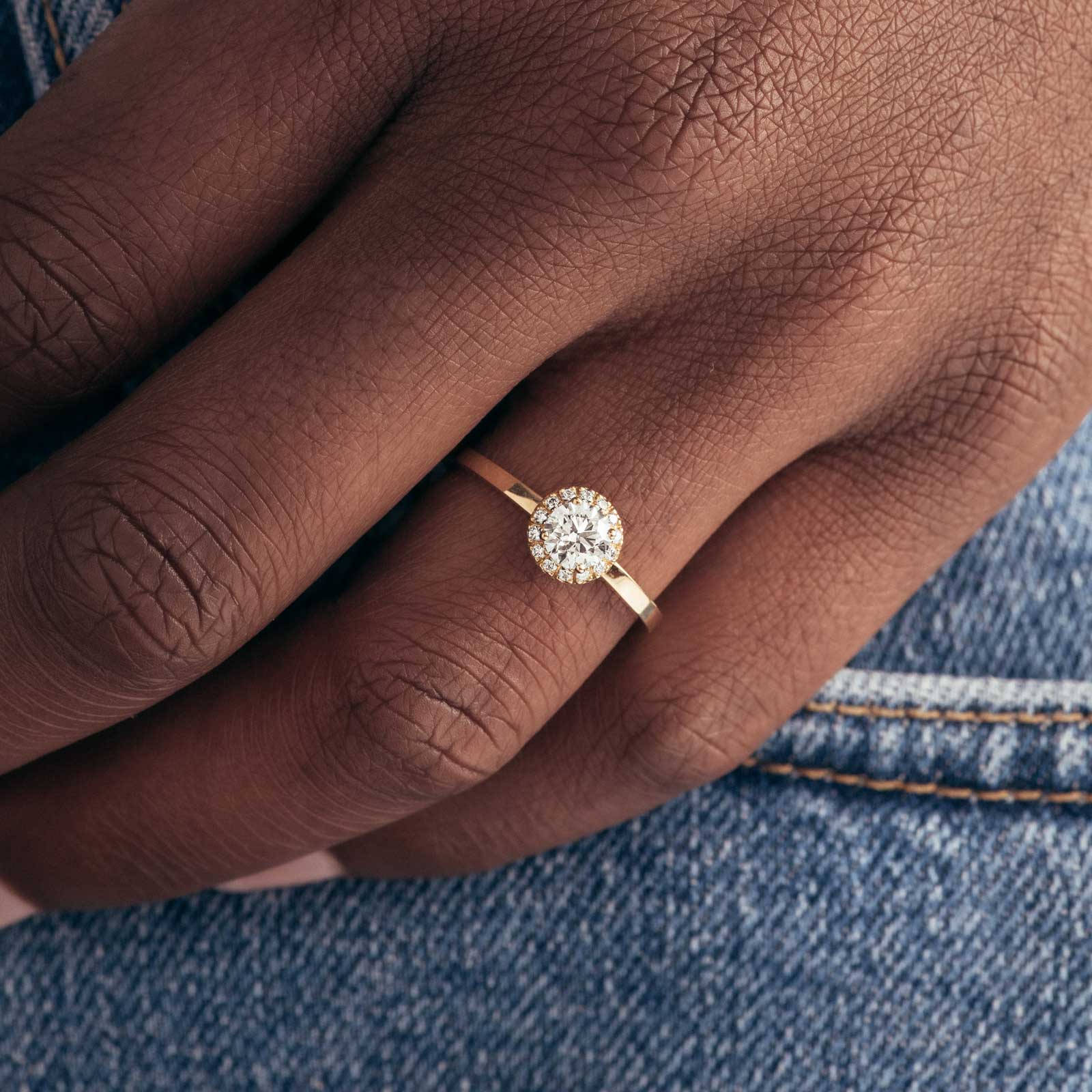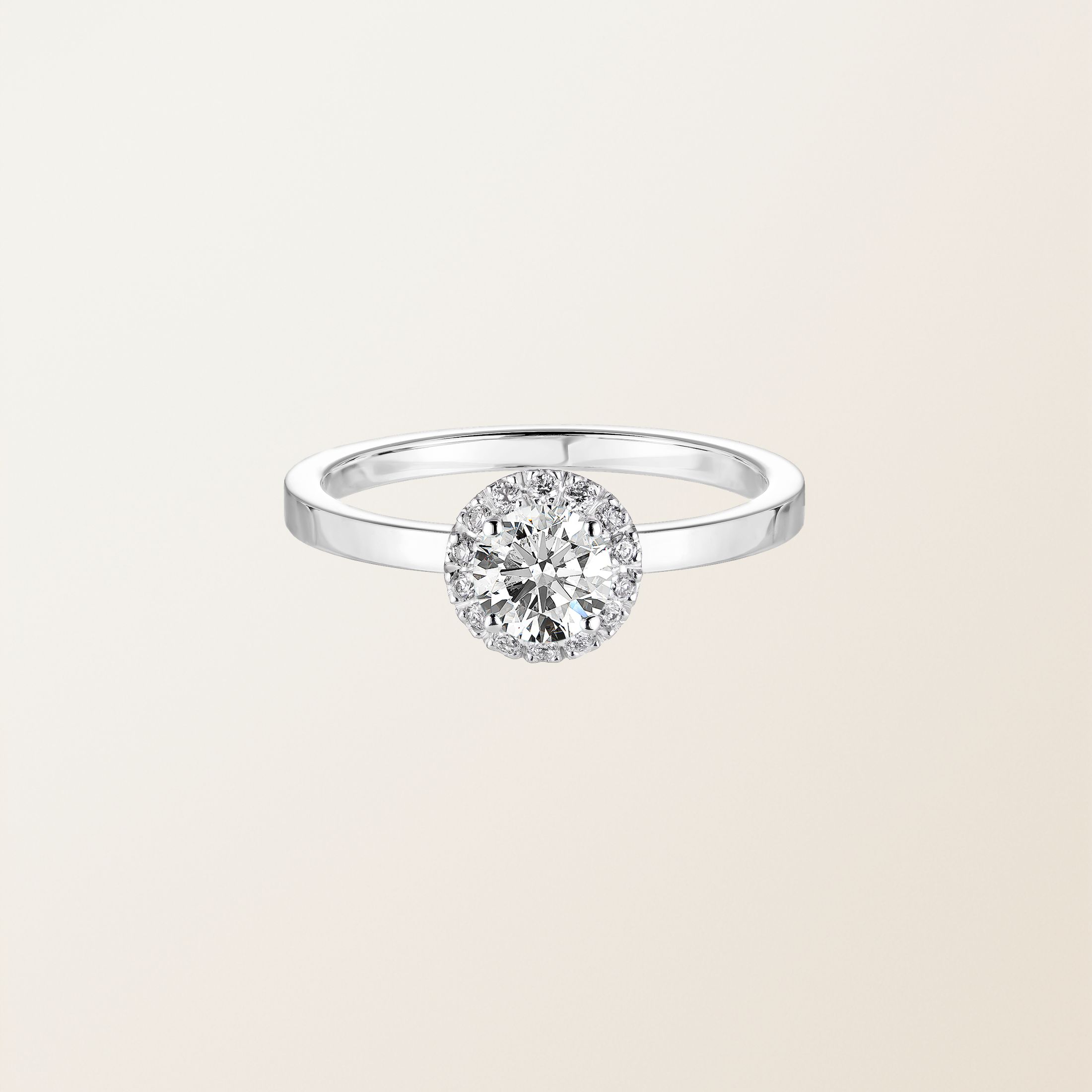 - Une bague de fiançailles ornée d’une pierre ronde de 5 mm entourée de diamants