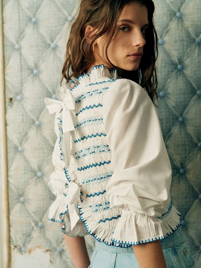 - Volant brodé inséré à l’encolure, aux emmanchures dans le dos