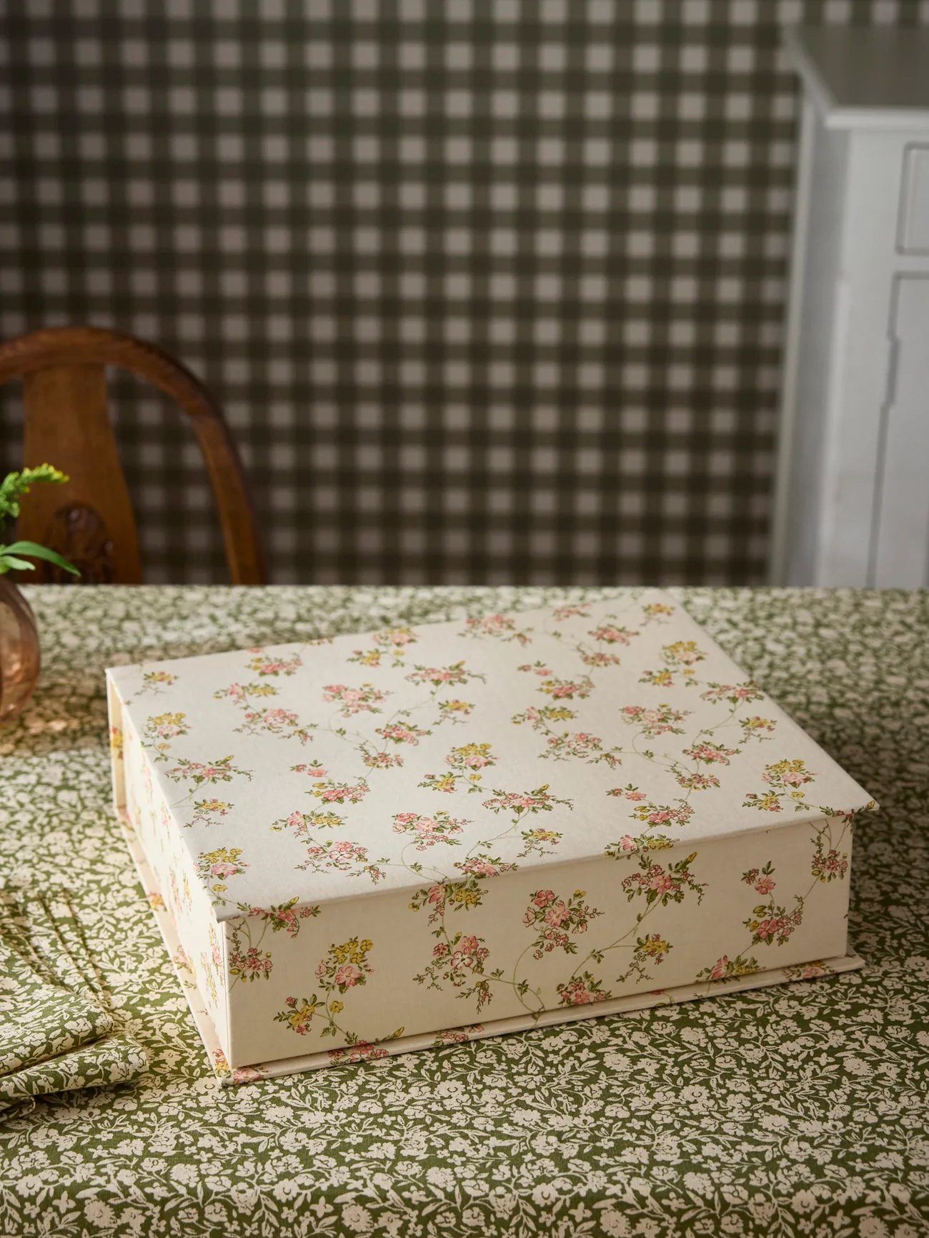 Boîte de rangement décorative recouverte de tissu imprimé Lilibeth. L’imprimé Lilibeth est un motif exclusif également présent dans notre collection Linge de maison. S’ouvre et se referme grâce au couvercle rabattable. Fabriquée en Inde de façon artisanale.