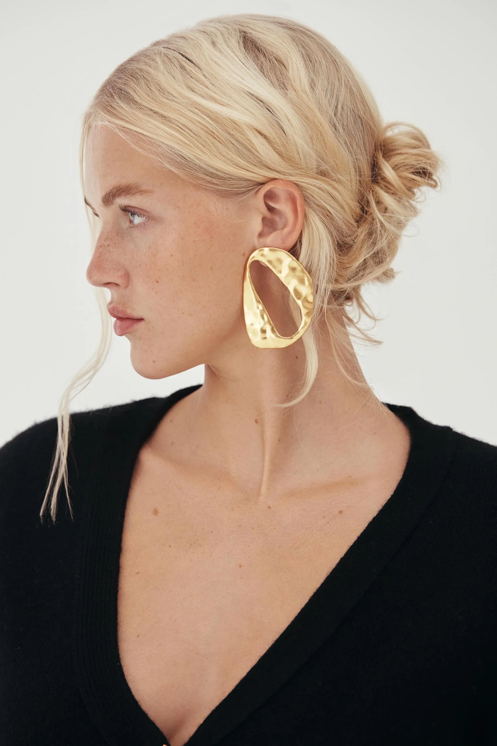 Une boucle d’oreille sculpturale en laiton qui joue avec l’espace négatif.
