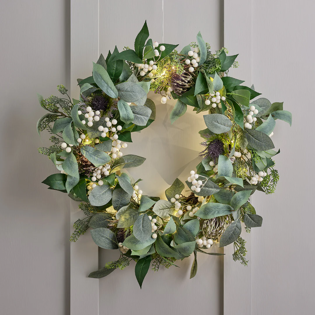 Apportez une touche festive et élégante à votre maison avec notre magnifique couronne de Noël pré-éclairée à baies blanches. Avec un diamètre de 60 cm, cette couronne est fabriquée à partir d’un mélange exquis de feuillage artificiel, parsemée de délicates baies blanches, évoquant la beauté des paysages hivernaux. Cette couronne est dotée de 50 micro LED blanc chaud qui émettent une lumière douce et chaleureuse, créant une ambiance féerique et accueillante. Les LED sont judicieusement intégrées dans le feuillage, assurant un éclairage homogène et subtil. Insérez simplement 3 piles AA dans le boîtier piles et choisissez la fonction optionnelle de minuterie de 6 heures pour une lueur automatique nuit après nuit.