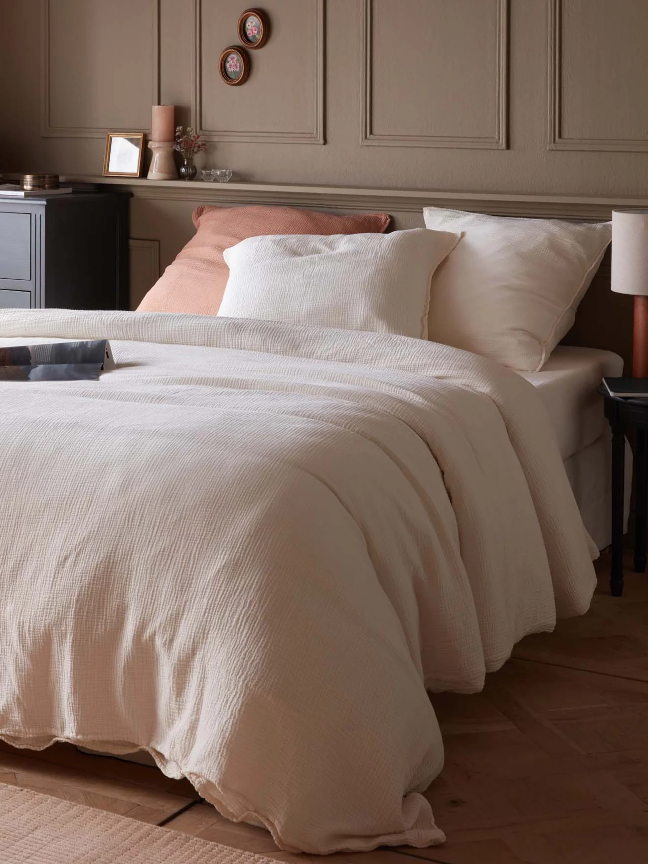 Housse de couette en gaze de coton tissée et confectionnée au Portugal. Son aspect légèrement gaufré procure une réelle sensation de confort doux et aérien.