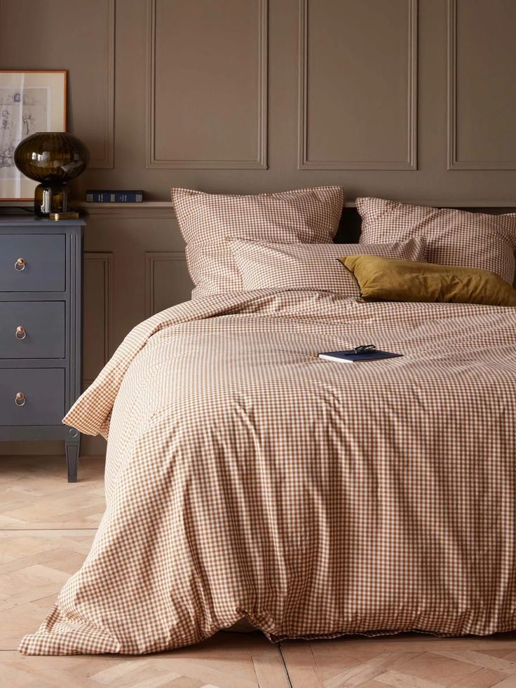Des petits carreaux couleur caramel pour réinventer le vichy avec justesse et modernité. Housse de couette en percale de coton tissé-teint recto/verso, délicatement lavée pour encore plus de douceur.