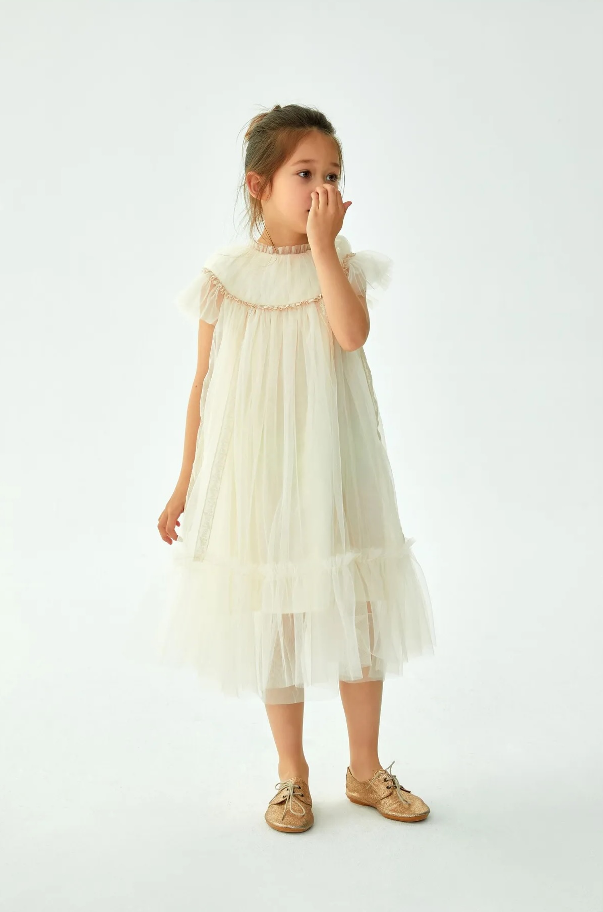 Robe A-line sans manches avec col à volants, empiècements en dentelle et jupe froncée à taille tombante, équilibrant volume moderne et touches traditionnelles.