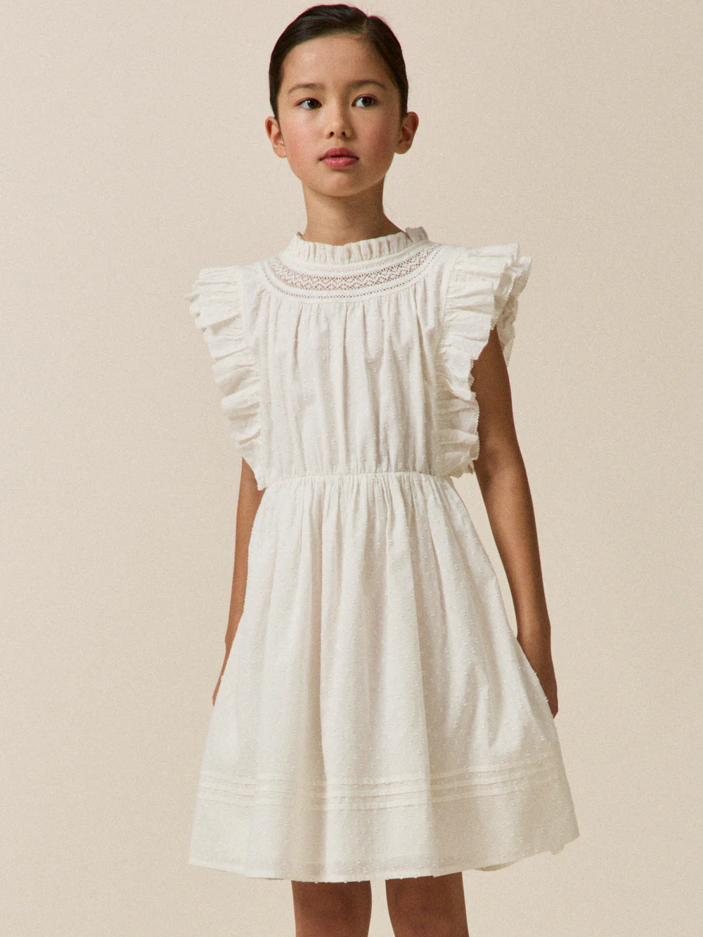 Cette robe est pensée dans les moindres détails : col officier volanté, découpe collier en dentelle, jeu de fronces et volume dansant sur un délicat tissu plumetis.