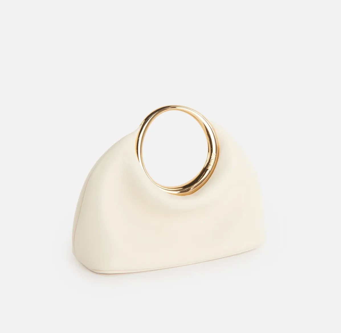 Contemporain, Le petit Calino est le petit dernier de la maison Jacquemus. Conçu en cuir lisse ivoire, ce petit sac à main arbore une anse unique rigide ainsi que d’une fermeture aimantée. Le nouveau it-bag à ne pas manquer.