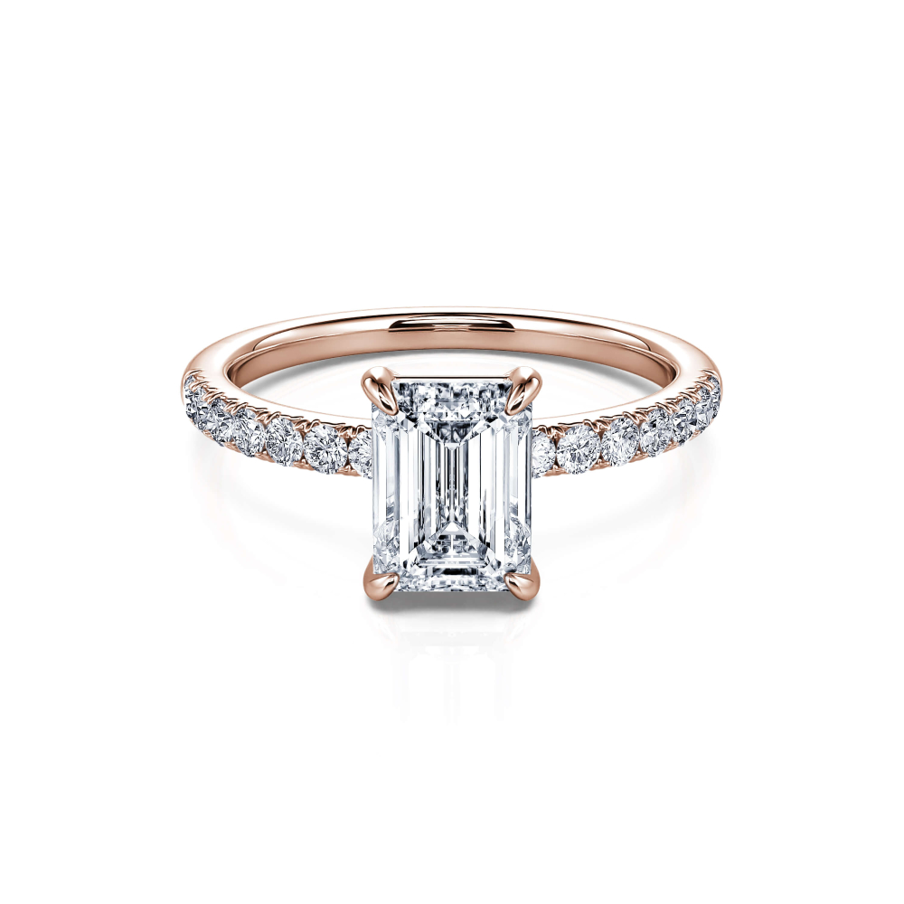 Romane, c’est la création d’inspiration contemporaine. Cette bague de fiançailles en or rose 18 carats offre, en son centre, un diamant taille émeraude d’exception, de 0.50, 0.70 ou 1ct sur une monture délicatement accompagnée de pierres précieuses.