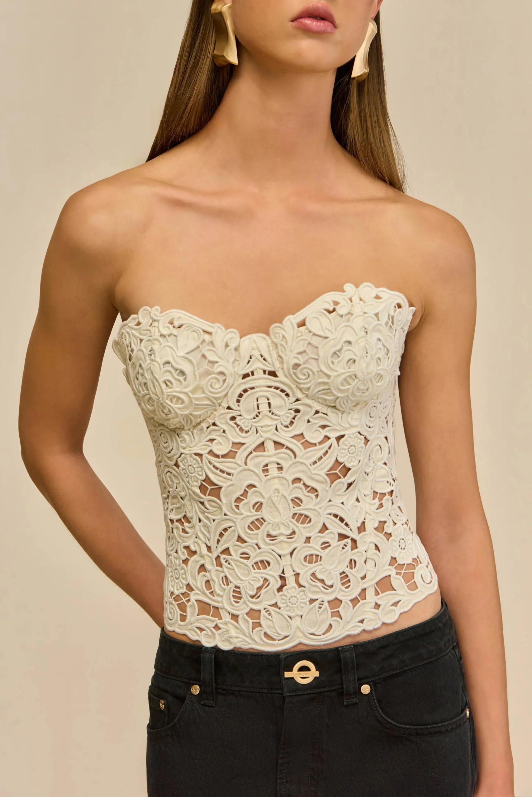 Un bustier structuré en lin, orné de délicates découpes florales en 3D, créant une texture aérienne et tridimensionnelle avec un aspect raffiné et fini à la main.