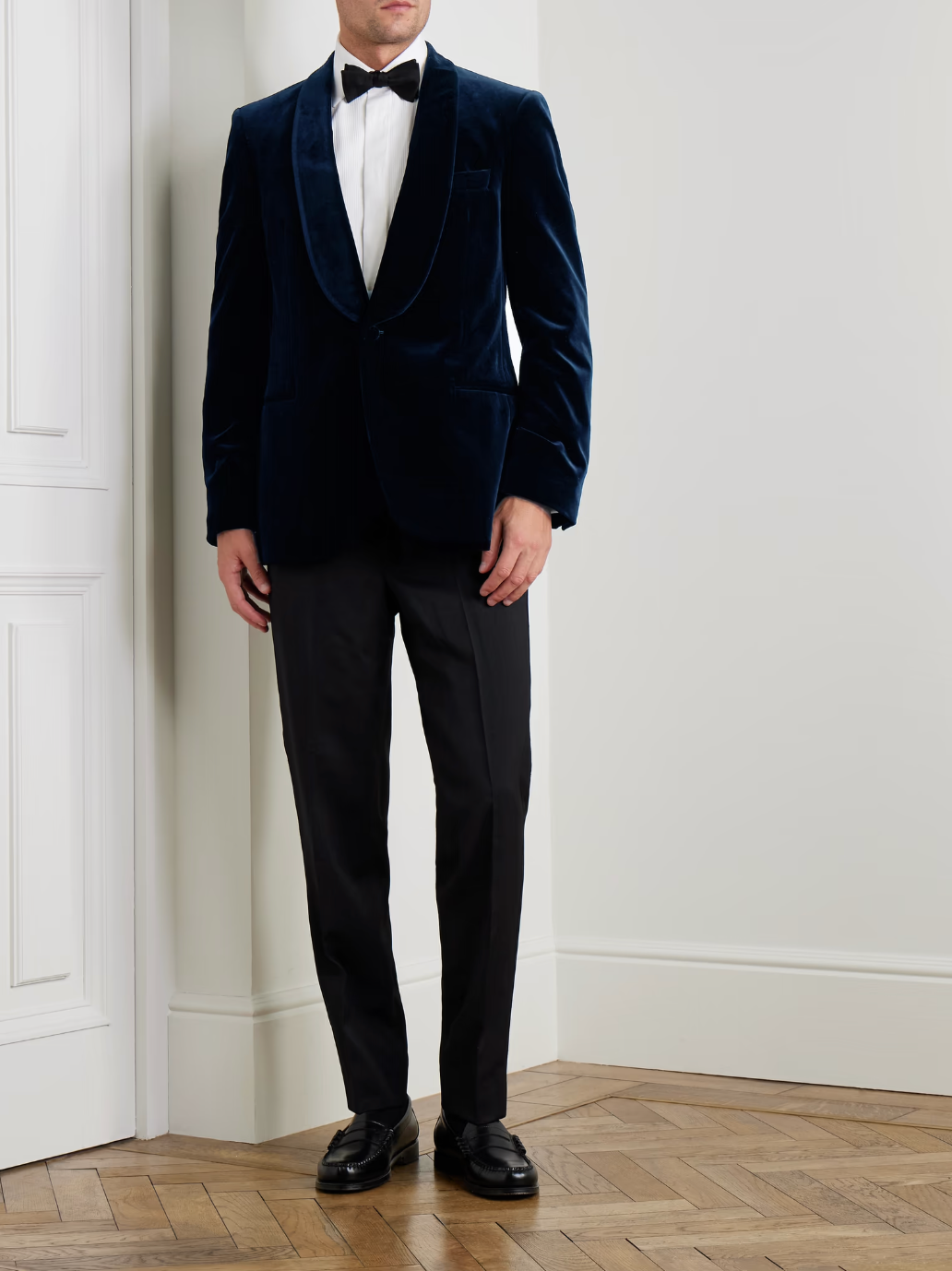 CRÉÉ PAR MR PORTER. Le Journal recommande une veste de smoking comme celle de M. P., une version élégante et moderne du smoking classique. Confectionnée en velours de coton mélangé, elle présente d’élégants revers châle et des poches passepoilées pour une silhouette épurée. Misez sur la simplicité pour le reste de votre tenue et laissez les textures s’exprimer pleinement.